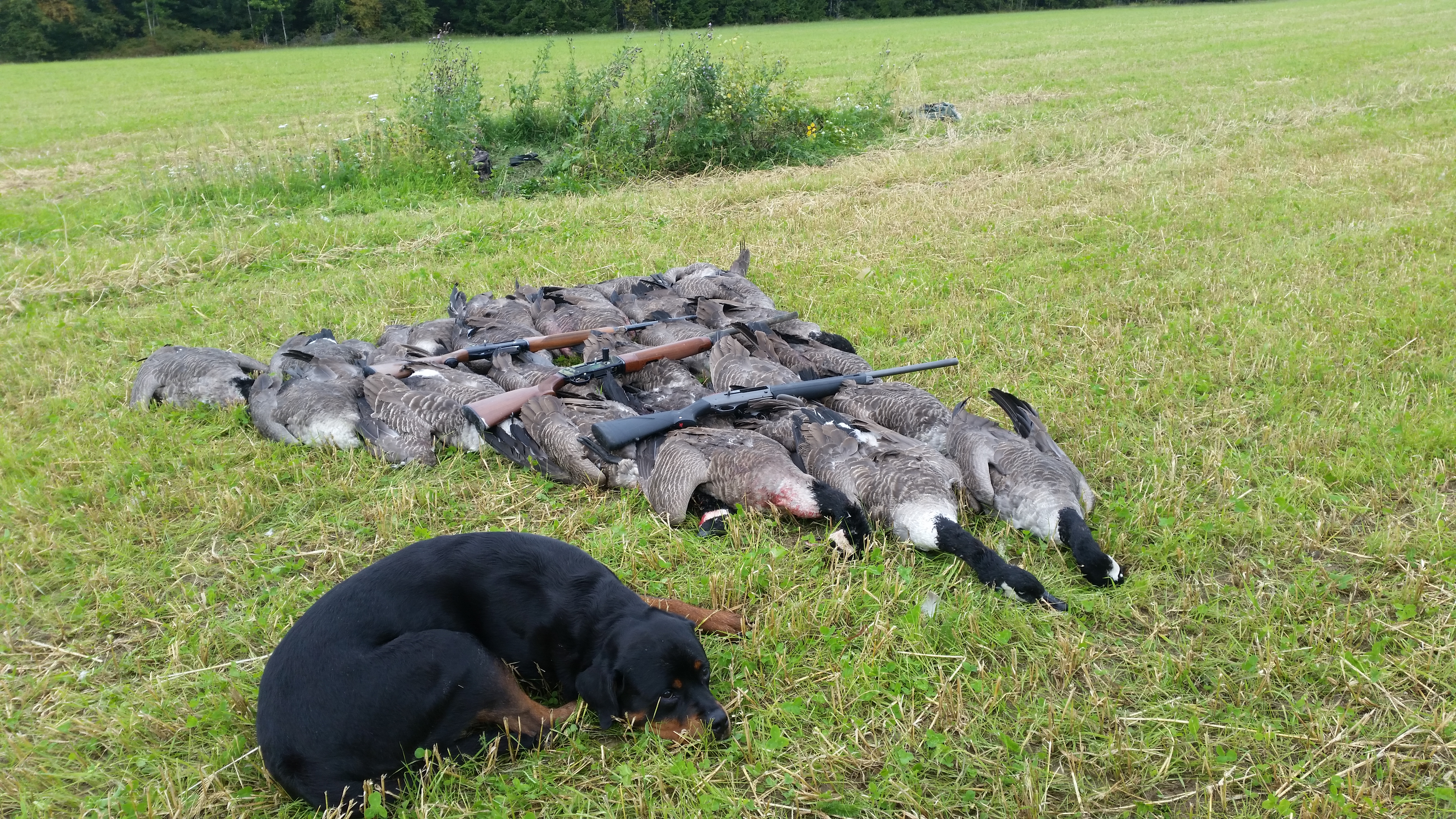 Förra lördagen innan de va dags å fara till vallen å älgjakt så lyckas vi få ner 27 gäss på morgon/fm. De e rätt många för att vara här i trakterna på 3 skyttar. Extra kul då jag körde Piggy (rottistiken) som gåsstoppare då dom va på väg å springa från oss. Ingen tvekan där inte. Lite springa i smällen å ovilja att apportera riktig få man väl ta... ![]()