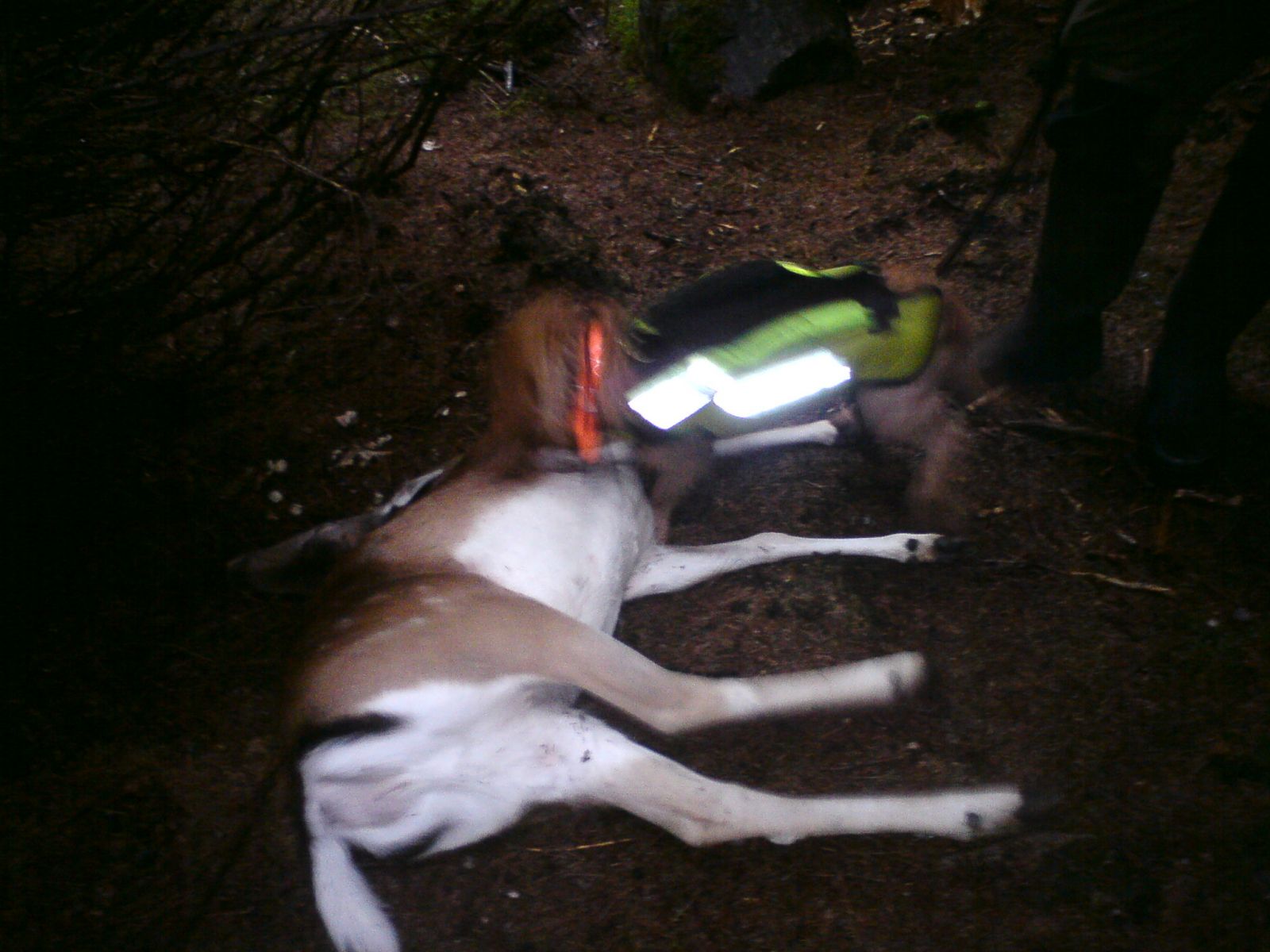 Var ute och släppte Basseten fauven Chippen och fick då efter ett långt tapptfritt drev några stänkdjur i pass, riktade in mig mitt i bogen och skottet gick..inget blod eller ragg på skottplatsen. Hunden blåses in..får lugna sig då skottplatsen undersöks noggrant. Senare får hunden gå..hinden är träffad i 5:1an sedan har kulan vinklat ut genom buken..därav noll fynd på skottplatsen!..spårhund behövs..flyktsträckan var 20-25m
