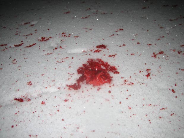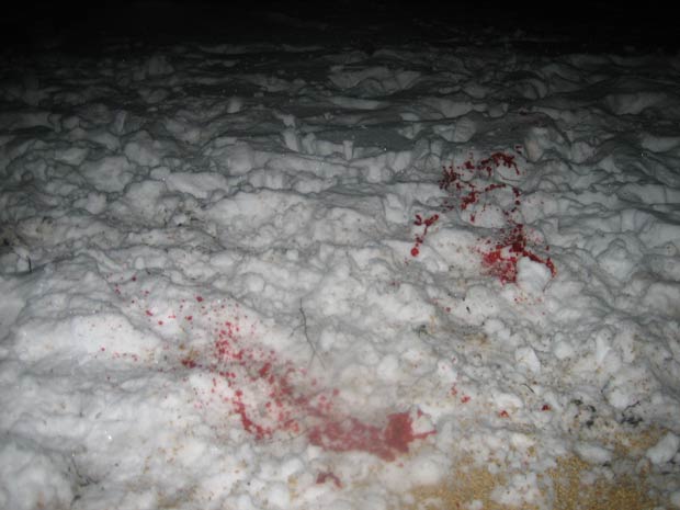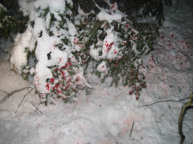 Publicerat Mars 24, 200818 yr Sköt en liten nasse nu ikväll. Vägde sådär 45 kilo levande. Var en rejäl galt framme precis efter jag satt mig vid 18.00. Såg ut till o vara en 150+ nånting. J-klar va maffig han var och extremt försiktigt, skymtade rejäla betar också. Faen att det inte är tid för sådana nu, men hans tid kommer nog va de lider. Han stack ganska omgående, varför vet jag inte. Behövdes nog inte mycket för att en gosse i hans kaliber ska ana ugglor.. Sen kom en råget som skulle smaska lite gottis också, men när hon så flydde fältet så trodde jag först att galten var på väg fram igen men det visade sig vara 2 suggor o 2 årsgrisar. Efter en liten stund så var den minsta fri och skottet gick 18.45. Såg att den jag sköt på drog iväg åt annat håll än de andra tre. Skottplatsen såg ut såhär. 3 m bort i löpan låg denna bit. I skogskanten så hade blod stänkt långt upp på grenarna. Fasen va det ser ut på snön. Ett perfekt tillfälle att låta unghunden göra sitt första staplande dödsök.. Filmade lite och klippte ihop det till följande filmsnutt. Film på dödsöket Ser väl inte sådär tokigt ut men ni ska veta att hon tyckte det var skitläskigt tills vi var framme vid gyltan. Nu är hon inte mer än 9-10 månader, född 1 juni så vi är nog i värsta ”spökåldern” än. Men som jag lärt känna henne så lär nästa dödsök gå 100 % bättre.. får vi hoppas