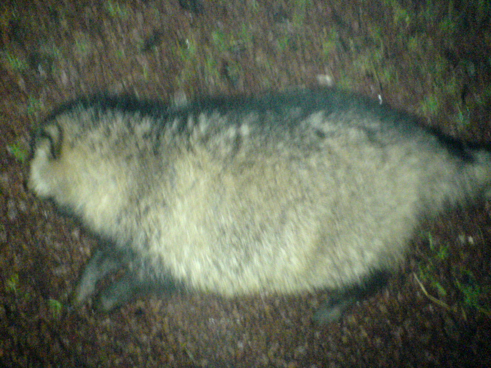 en fet mårdhund på en bra bit över 10 kg från i höstas, sådär ska dom vara i färgerna. den som satt i fällan igår så var som sagt RÖD?!-->