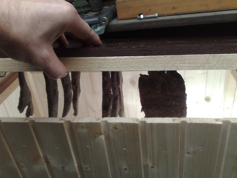Publicerat December 22, 200817 yr Tjena! Jag blev tipsad av "Token" från Edsvalla om detta igår och kunde bara inte låta bli att testa detta. Stormade ner i källarn och slet fram några lämpliga köttstycken från älg som har legat på upptining. Åkte till affärn på förmiddan idag och köpte in alla ingredienser. Den där jäkla Worchestershire-såsen var inte lätt att hitta men det löste sig det också till slut. Sen till Kjell å C/O för att inhandla en fläkt och så upp till Clas i plurret för att köpa en lampa för flask-montage. Full gas hemmåt för att göra iordning köttet, blanda till kryddmixen och vinägern. Skar till lämpliga skivor av köttet och gjorde allt enligt beskrivning och sen skjuts in i kylen med bunken. På med stor-stövlen och så ut i garaget för att snickra ihop min låda. Kapade till två skivor formplyfa 300x600x12 mm som lock och botten. Hade kvar sedan höstens bastubygge en del bitar bastupanel som jag har använt som väggar på min låda. Knåpade ihop dessa och drog fast allt med spikpistolen samt kapade till lite extra sträv inuti lådan. Ja, va fanken, se själva på bilderna, höjd på lådan är 43 cm. Ska på glöggafton ikväll och kommer hem i lagom tid så att jag kan hänga in köttet i torken innan jag går isäng. Ska bli mycket intressant att få se resultatet av detta.