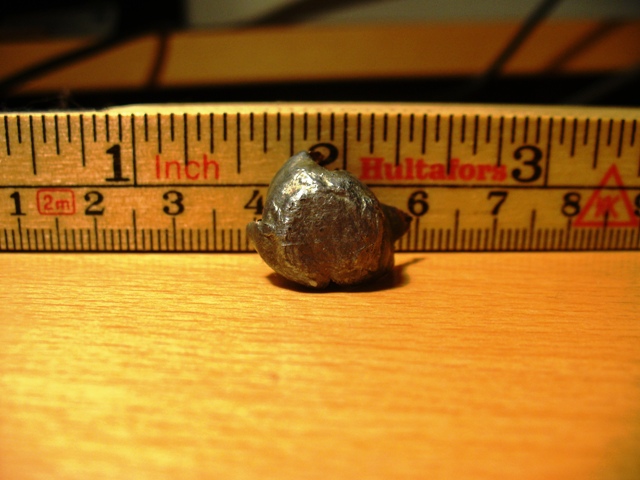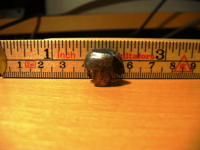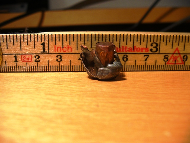 Publicerat September 21, 200817 yr kaliber: 30-06. Kula: Sako super hammerhead 11,7g/180gr. (fabriksammunition) Restvikt 9g, vägd på en brevvåg utan decimaler. Skjutavstånd ca:110 meter. Flyktsträcka ca:15 meter. Slaktvikt älgtjur ca: 220 kg. Ingångshål precis bakom revbenen på höger sida och kulan stannade innanför bogen på vänster sida (nådde ej fram till bogbladet), den har ej rört något ben på vägen i älgen.