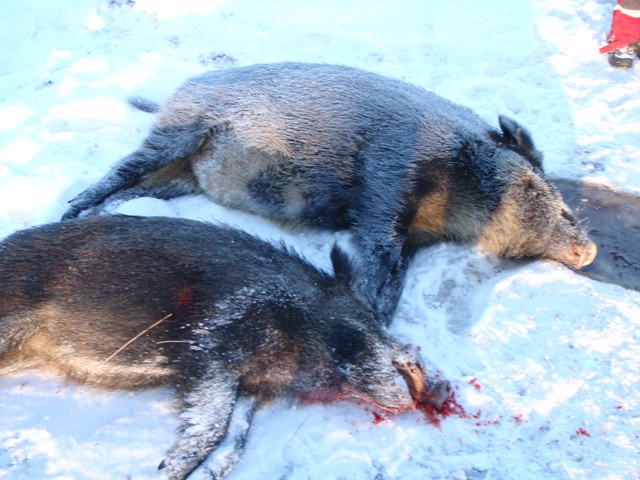 Publicerat Februari 15, 200917 yr Påringning inatt, jag jobbade men de kunde inte få tag på någon annan. Eller en på området svarade iofs men va allt annat än körbar... Sa jag skulle ringa upp, j-vla liv på danshak… Fick senare uppgifterna, 2 grisar påskörda förmodligen en i diket. Ordentlig smäll, ska va utmärkt med viltband 200 m från olyckan som skulle skett i anslutning till kommungränsen. Jag kunde inte komma ifrån o fick inte tag på någon annan heller. Slutade jobba vid 3.30 o va rejält sliten. Beslöt o sova några timmar innan jag åkte ut. åkte vid 7 snåret. Ångrar jag idag… Körde i alla fall dit o en bit innan så ser jag en rejäl sugga ligga snyggt på vägkanten intill en betesvall med högt gräs, vet inte va de heter, gräset alltså, men är vassliknande… förmodligen hatat av bönder för boskap brukar aldrig äta av det.. Parkerar o kollar suggan som tydligen dött där den låg. Glassplitter på vägen vittnar om var olyckan skett. Tar en lov o kollar spåren men ser inga direkta språngspår. Verkar som grisarna gått o letat ollon i diket. Är några hus intill o jag hör hur en pappa ropar till nån unge att de ska gå o titta på grisen. Samtidigt börjar mina hundar skälla grovt i bilen. Kollar på bilen o ser att de (hundarna) sitter o tittar ut mot betesvallen. Samtidigt ringer polisen igen o säger att det ligger en död stor gris i väggrenen o en kulting ligger o sprattlar på åkern precis innan. nån billist som kört förbi o sett det, en smitning trodde de. Ok jag är där nu svara jag, fast det är säkert nån km till kommungränsen så lite konfunderad var jag. Inget viltband har jag sett heller. Samtidigt så anländer pappan o dottern med en gammal labbe i koppel för o kolla på den döda grisen. Spanar ut över åkern o ser en svart klump 80 m ut. Tar ut bössan o säger till "publiken" att det ligger en gris till som lever där ute. Nu såg jag vart den gått av vägen också, tydliga hasspår längs med stenmuren o bakom stockahögar. Precis i kanten där jag parkerade bilen har den hasat fram o tryckt intill muren och krupit längre ut efter att jag lämnat bilen, jyckarna observerade den o skällde på synen, givet. Hoppade över taggtråden o muren, då försökte gyltan ta sig ännu längre bort. Såg ut som framvagnen funkade illa, hon såg ut som en hotrodd. Kanade på trynet. Den vore extremt lättställd för unghundar... Gick ifatt och rundade så jag kunde skjuta säkert mot skogen o satte en pärla i öronroten. Gick tillbaka med bössan o drog sen ut grisen till suggan. Pappan o dottern visste vem som jagade där så det va snabbt löst. Körde sen o letade efter viltbandet ända bort till kommungränsen o den byskyllt jag först fick som beskrivning men hittade inga mer olycksplatser o inget viltband. Lustigt egentligen för olyckan va ju 1 km fel enl beskrivningen. Men hur stor är chansen att där varit 2 olyckor inom 1 km där fyra grisar blivit påkörda samma natt/morgon. Varav den ena i så fall skulle va en smitning. Vet ju inte hur bilen såg ut men de hade i alla fall kunnat köra den från platsen trotts stendöd gissningsvis 120 kilos sugga o en gylta på kanske 70-80 kilo halvförlamad. Ångrar bittert att jag inte körde direkt inatt, gyltan har ju legat o plågats några timmar extra på de här viset. Tänkte mest i banor om att jag förmodligen inte skulle komma hem o få sova förrän framåt förmiddan om jag åkt ut direkt. Ska gå på o jobba vid 18 igen så.. men det är alltid lätt o va efterklok.. Gyltan där jag sköt henne. Paraden vid stockupplaget, tjejens ena fot syns i höger hörn. Suggan överst ligger där hon dog.. Syns inte riktigt hur stor hon va men hon va rejäl och säkerligen dräktig. Förmodligen och tyvärr gick det väl en 10-15 grisar i en smäll... Tror gyltan va dräktig oxå.