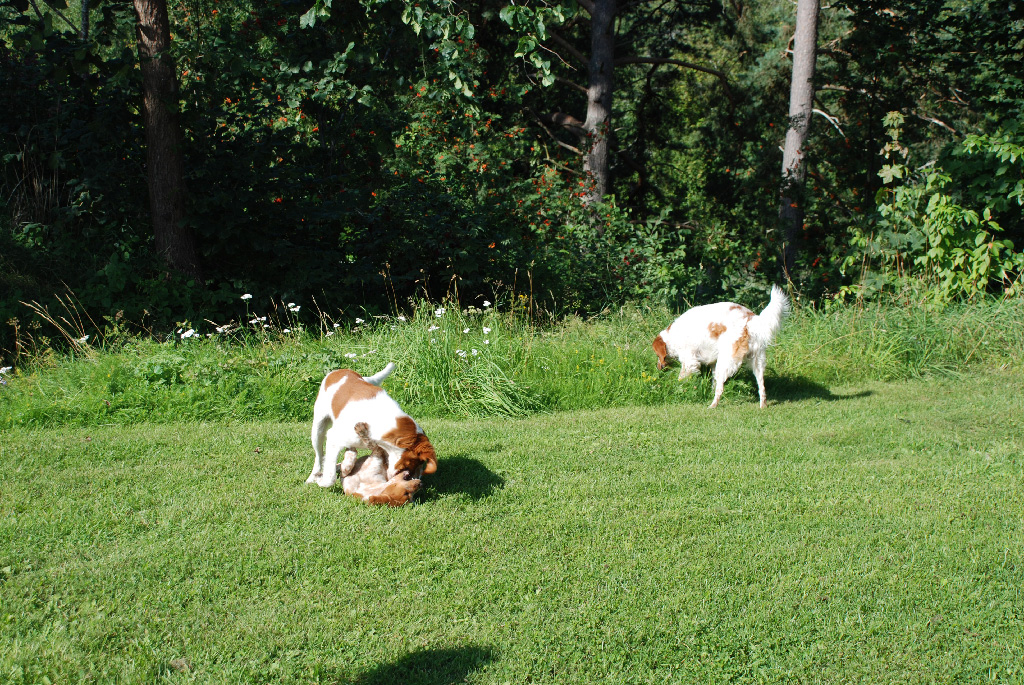 Publicerat Augusti 19, 200916 yr Vart mer orolig för Zingos överentusiasm mot fåren, hmmm.Sen har Zingo o Primus fått stifta bekantskap med Traste ngra dagar under tiden husse m.fam. fick ypperligt god mat och en invigning i Mc Myras lilla värld. Det tackar vi för "Jens m.fam"' tusenfallt för- Va fin Traste är på bilden (antar att det är han t.v.) ....men han ser nästan onormalt lugn och avslappnad ut för att vara en Breton Primus ser ut å va lite mer på bettet...hehe