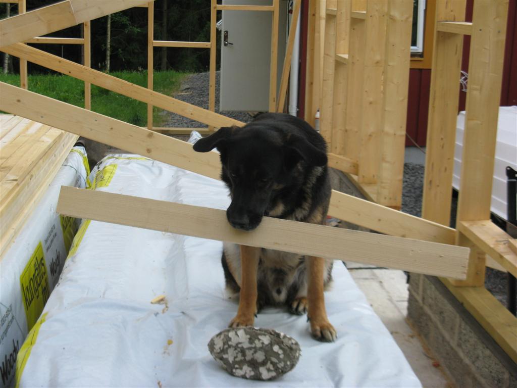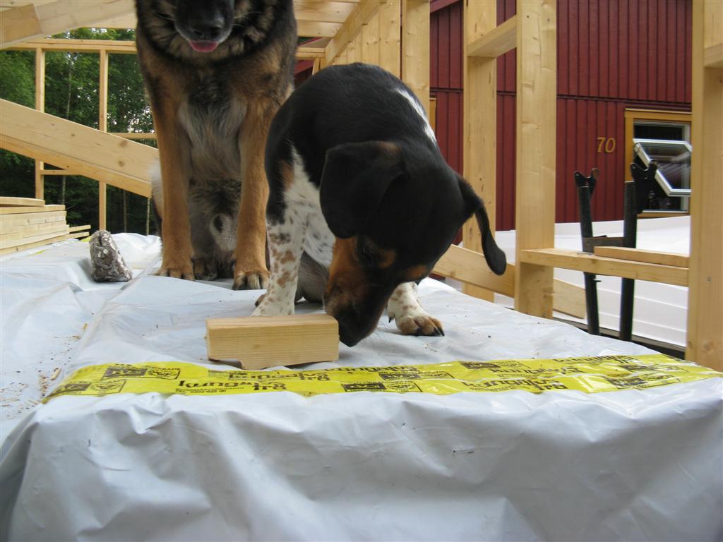 Publicerat Juni 29, 200916 yr Ja ja, skall slänga upp nån bild eller två. Murning, skift ett av två En mycket arg och otrevlig ungdom... Första skiftet, nästan färdigt. Skift två av två. Å igen Förman (förhund) Adolf lackar ur för att jag betar av hans viloplats Äntligen färdigt med murningen. Virket har kommit och jag började lägga syllen. Kan tillägga att jag började kl 16.00 på fredagen Hörnstolparna på plats, en styck hustru har gottat ner sig med en pilsner. Undertecknad avnjuter en välförtjänt kall. Klockan ett på natten å ölen smakar fint. Kvalitétskontroll av Adolf med assistent Herman Här har jag tvångsvervat en dräng vid namn Peter. Att sätta reglar går fort när man är två. Peter jobbar inte bättre med pilsner i handen. Av att dölja på hans lilla mage så gillar han öl. Nu jävlar, snart klart för hammarband. Japp, färdigt för hammarbandet som givetvvis blir dubbelt. Varv ett Sen dyker det upp två bonnläppar samt Peters hustru. Hermans tax-kompis Hector följde med. Äckliga människor som gillar gratis mat och öl... Fulla kompisar. Nånstans efter kl 02.00 å jag bara måste hamra lite till... Lyckades lura upp frugan. Söndag morgon, typ 09.00 eller nått... Snajsigt värre. Herman är inte rädd för höjder Läckerbiten själv. Hunnkräken skall vara med å busa medans husse snickrar. Å dom är överallt... Här på långsidan skall svarven och fräsen stå. Frugan poserar som om hon gjort allt.. Adolf hjälper gärna husse Don efter person... Hell yeah! Detta är vad vi snackar om. Måste jobba jävlit dåligt mtp blicken jag får av förman Adolf. Här får Herman en avlusning, puckad liten hund går till attack mot Schäfer-Dobermann blandning Liten men tuff