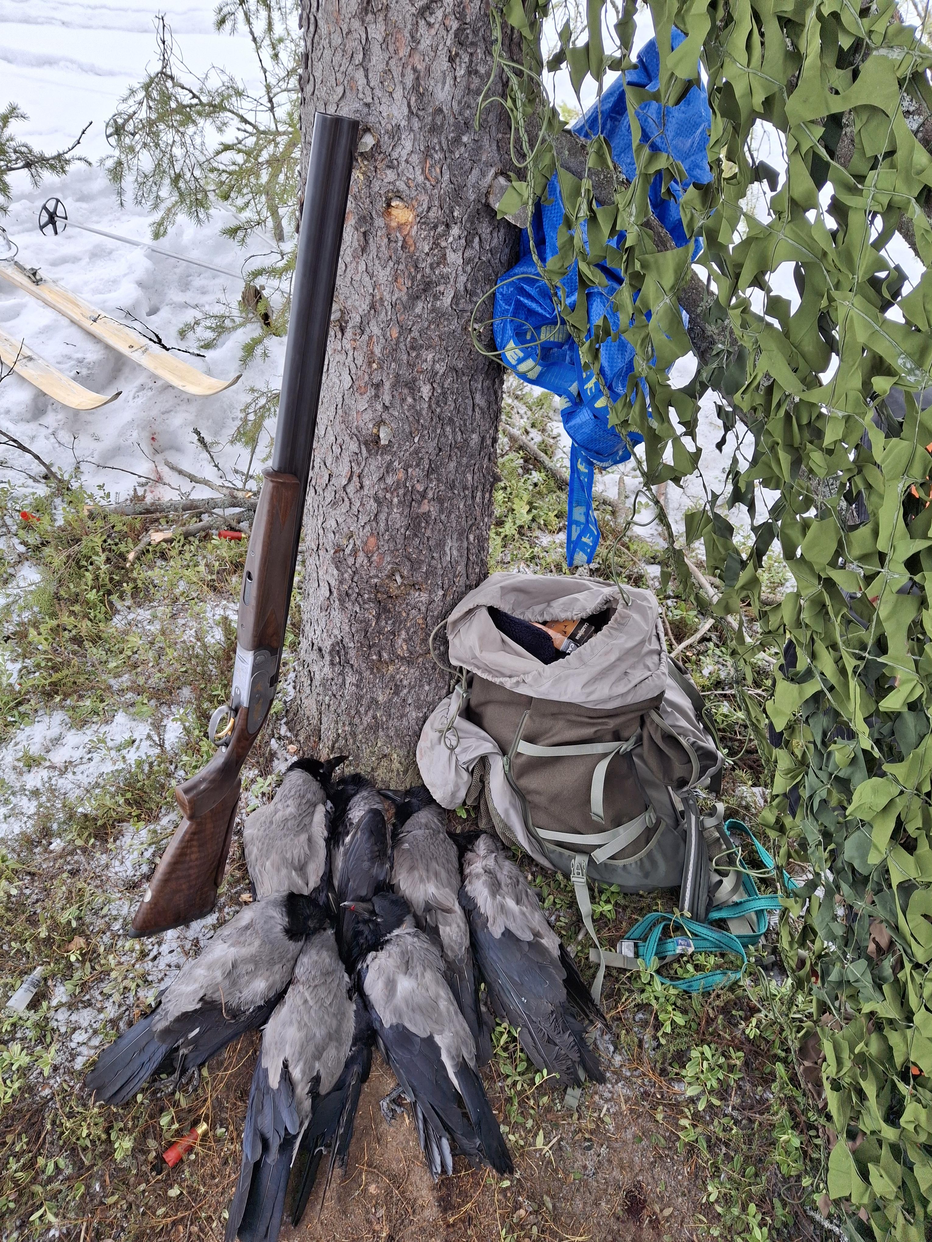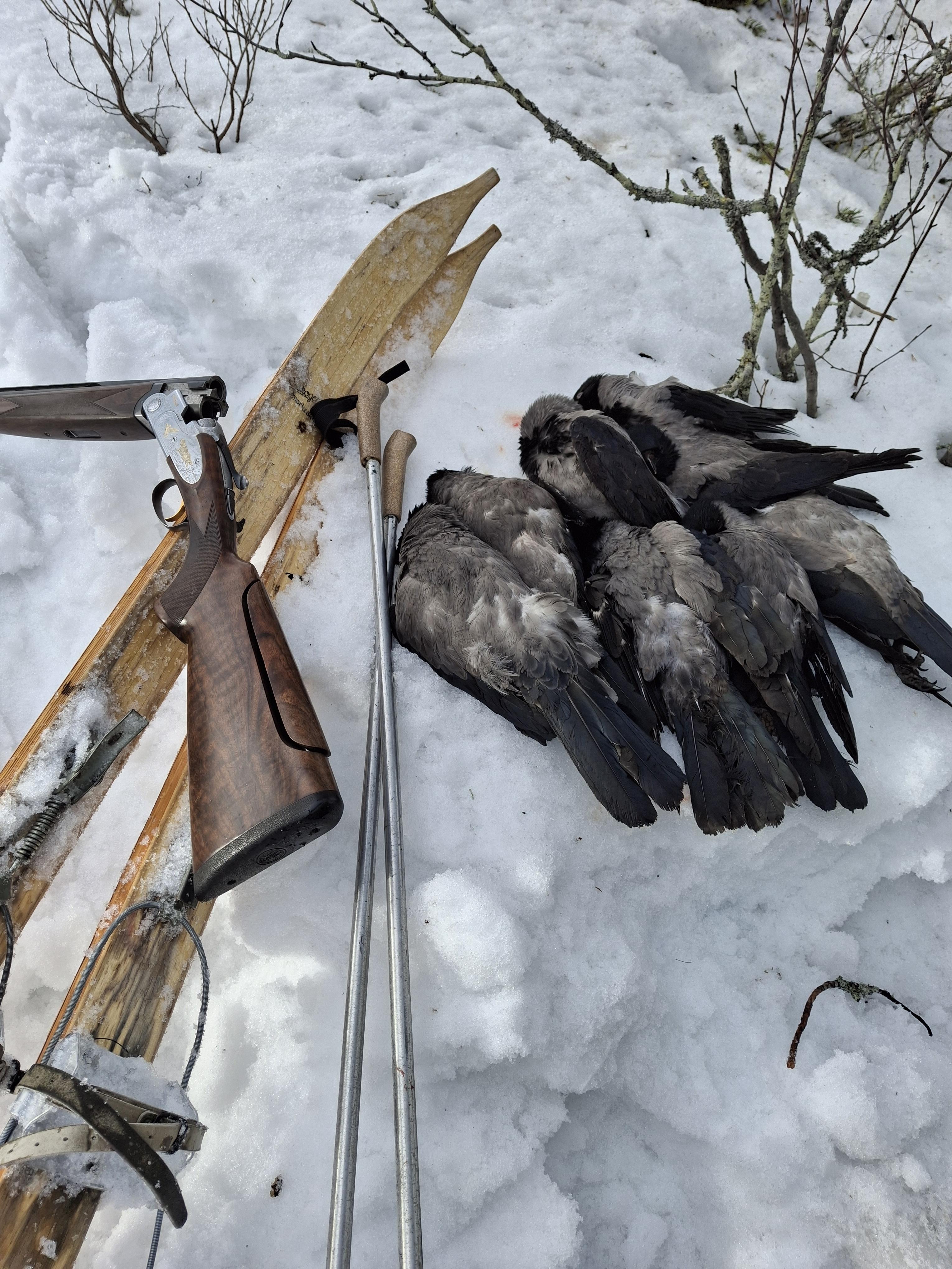 Publicerat April 1, 20251 yr Detta är en populär post. Landade hemma i Kiruna på söndag efter 5 veckor i Thailand & då jaktsuget var stort så stack jag ut lite på vinst och förlust mitt på dagen idag,satte en näve hagelskott i jackfickan och hoppade på skidorna där det brukar flyga kråkor mot tippen. Gömde mig bland några täta granar och började blåsa i kråkpipan & resultatet efter ca 2 tim blev 9 kråkor så jag är nöjd.