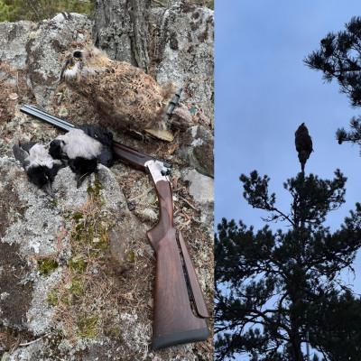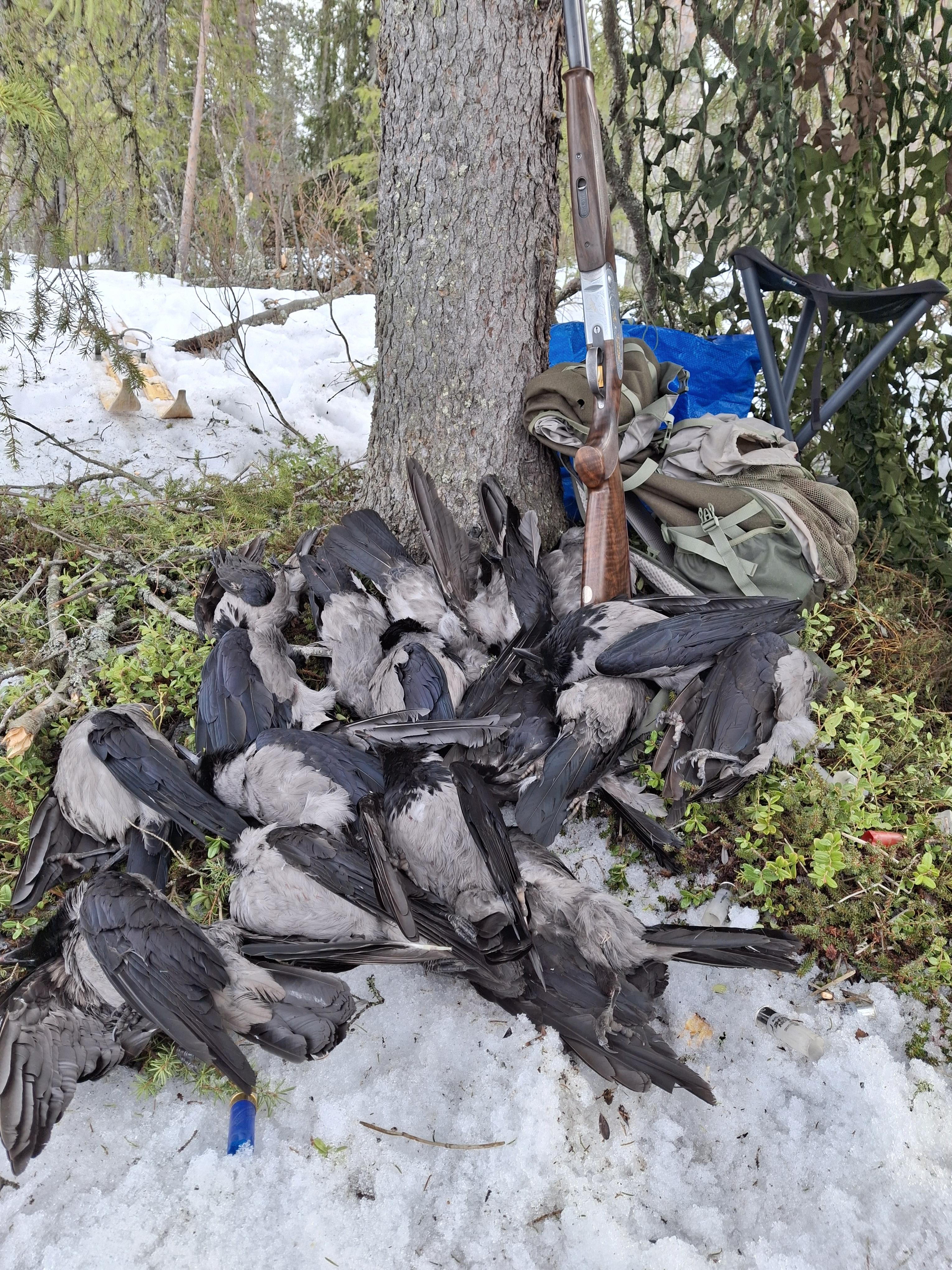 Publicerat April 2, 20251 yr Detta är en populär post. Gjorde ett mera seriöst försök på samma ställe idag,ställde in morgon jakten då det var halv storm då. Men framemot mitt på dagen efter lunch så stack jag iväg med camo nät,uppstoppad duvhök och allt annat som behövs. Byggde snabbt ihop ett gömsle mot en tät gran & började locka,tog inte lång tid så fick berettan leverera hagelskurar mot ilskna kråkor,flög även förbi några närgångna korpar men dom är ju inte lovliga här Men fick ihop ett gäng kråkor till slut