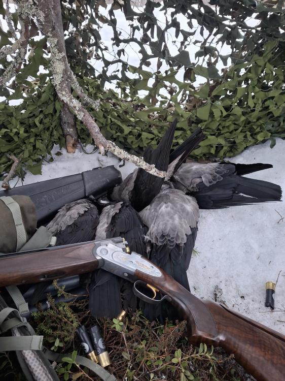 Publicerat Januari 9, 201115 yr I går var ute och kollade lite på markerna (insåg att skidor/snöskor är ett måste) så kom en kråka som fick sig ett skott! Detta var min första kråka: Idag åkte jag över till granngården och sköt 3st kråkor (dåligt med ammunition) som lustigt nog behövde ca 2 skott var, sen var ammunitionen slut! Men roligt var det! Mvh!