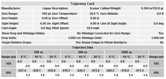 Publicerat Juli 19, 200916 yr Jag roade mig lite med att göra ett ballistikkort ut till 800 yards, där även temperatur och höjd över havet varierar. Tog en Scenar 155:a i 880 m/s för skoj skull. Som synes är det väldigt små skillnader i kulbanan oavsett om det är 0 eller 20 grader ute - eller om skyttet bedrivs på nära nog havsnivå eller på 1000 meter? Vad är det jag missar? Är det inte större skillnad än så här? riktigt duktigt gjort!