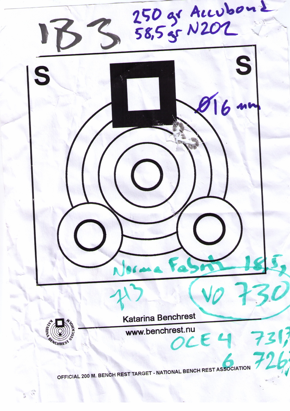 Publicerat Juli 24, 200916 yr Författare Det var en alldeles för blåsig dag idag för att testa laddningar på skjutbnan. Byig vind och det varierade från vindstilla till knak i träden, helt sinnessjukt. Jag bestämde mig för att dega lite och njuta av tillvaron i största allmänhet, och skjuta lite mindre, men jag fick två tillfällen av temporära vindstillestånd så att jag kunde treskottsserier av de plugg jag tänkte använda för OCW-ändamål. Så även om det bara blev två serier idag, och lite för få skott per serie för att man skall bli nöjd på grannforumet Nöjer jag mig med att konstatera att det skall nog gå att få fason på Accubond-pluggen. Jag kronografklockade laddningarna ovan och under den skjutna serien och gissningsvis gör denna laddning 730-735 m/s så här kommer dagens enda träffbild som sköts med 9,3an: 16mm är ganska häftigt för att vara en 9,3:a. Det är rätt så mycket energi som levereras med rätt bra precision. Den OCW-serie jag tänkte skjuta är, för övrigt OCW 250gr Accubond Norma 202 60 OCE8 59,5 OCE7 59 OCE6 58,5 OCE5 58 OCE4 57,5 OCE3 57 OCE2 56,5 OCE1 Sedan hann jag skjuta en serie till, denna gång med min .308a. Det första skottet var ett läskskott, första skottet efter storrengöring av bössan. Även här tog jag en knippe skott i mitten av min OCW-stege, erfarenheten från förra gången jag var ute var ju att bössan sköt bäst med "normala" laddningar. Nu har jag inte hunnit skjuta så mycket med min nya ljuddämpade Remington XCR Compact Tactical (måste nog börja förkorta det, RXCT(poff) kanske?) men jag kan konstatera att jag aldrig har skjutit en träffbild överstigande en tum när laddningarna har varit just moderata... Går jag upp i maxladdningar sprider den över en handflata direkt dock. Nu är jag inte hastighetsfreak alls, så det gör inget och jag börjar verkligen gilla den här bössan...! Träffbilden mäter 10mm. Kulorna är Bergers 150gr. MVH! /HerrBerg