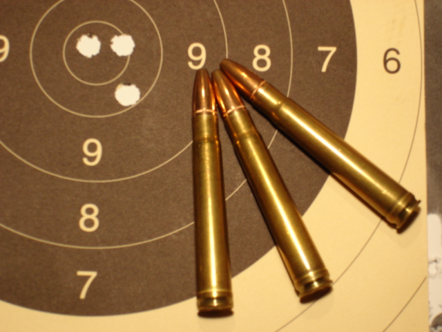 Här är senaste resultatet av ett besök på skjutbanan. Sako M98 .375 H&H tillverkad på 1950-talet, Zeiss 1,5-4,5x18 i Warne stålringar och baser. Ammon från min gamla Fiberclass .375 passade så jag tog de Speer 285gr jag hade låg liggandes. Ett skott för att hitta tavlan och 2 för att justera träffläget. Sedan sköt jag tre skott med följande resultat. Det skall bli spännande att få fixa till bössan med plastbäddning och handladdning så man får se vad den egentligen klarar av...