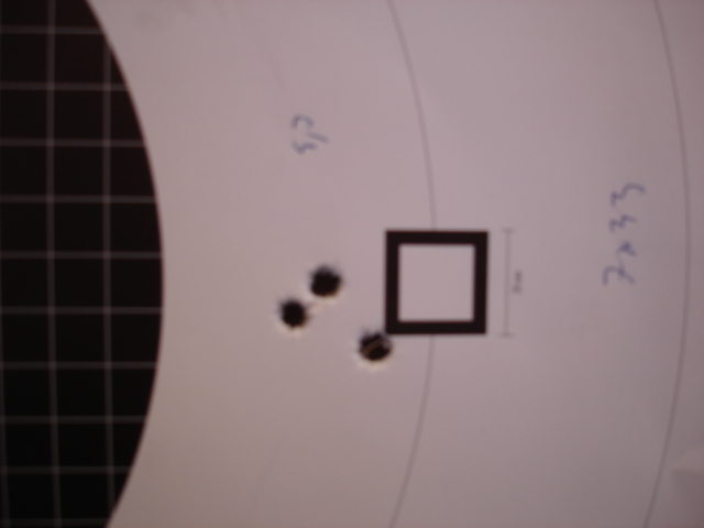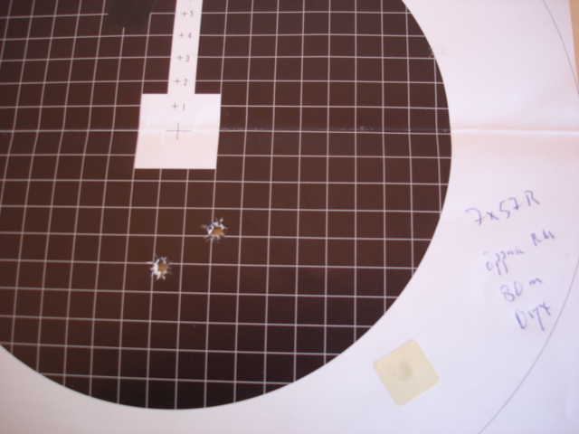 Publicerat December 21, 200817 yr Författare Jag hade visst ett par testtavlor jag inte skickat in bilder på - här kommer de första, för min Krieghoff Optima Drilling 20/7x57R. Den laddning jag använder nu med Oryx 170gr hittar jag inte- den mätte 17mm på 100m... och det var den första jag testade! Sedan var jag dock tvungen att dra iväg de andra testladdningarna jag tagit fram med Nosler PT, Nosler AB och Norma FMJ. Helt OK för en drilling! Sedan två skott med öppna riktmedel och Oryx.