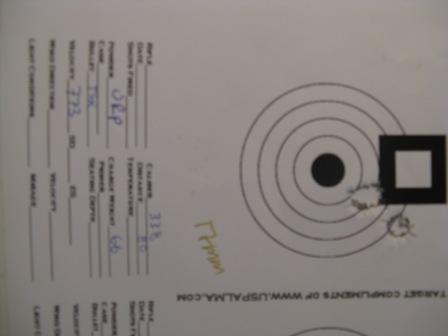 Publicerat December 22, 200817 yr Väntar,,, är det inte kväll snart../Lasse Nu är det kväll Till ämnet. Träffbilder i all ära men treskottare tycker jag är totalt meningslösa. Har flera ggr under utprovning av nya laddningar fått mycket små träffbilder på de tre första skotten för att därefter öppna upp till det tredubbla typ. Har lika många ggr fått de tre första skotten att skjuta okej för att därefter få de två sista att slå mitt i de tre första. Idag skjuter jag bara femskotträffbilder med alla mina vapen då det är det enda som ger mig tillräckligt mycket information. Jämna träffbilder även om dom inte är dom minsta är vad som betyder något. Som exempel lägger jag in en nyligen skjuten träffbild med min Marlin 336 i 30-30. 25 år gammal fabriksammo,150grains Winchester Silvertip. De tre första skotten i centrum av pricken mäter 30mm de sista två öppnade upp den till 44mm. Detta är inte den bästa träffbilden bössan skjutit inte heller den sämsta men ett bra exempel på vad bössan presterar i snitt. /Micke
