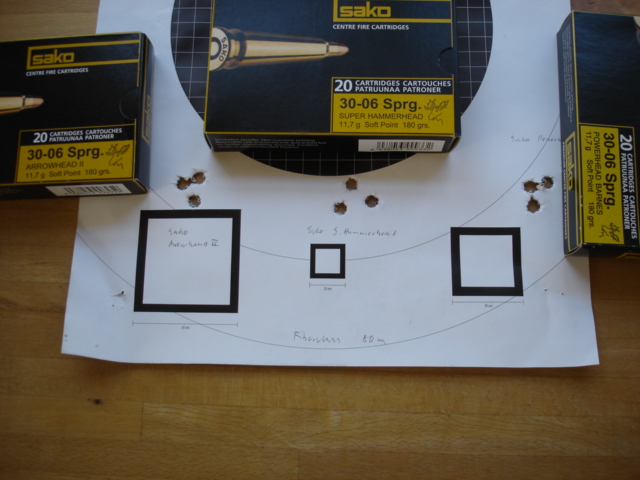 Publicerat Maj 5, 200916 yr Författare Jag tog ett besök till på skjutbanan med min gamla Fiberclass - nu med lite fabriksammunition från Sako. Jag sköt 3 skott med vardera sorten på 80m och här är resultatet.Nu får jag svårt att välja...