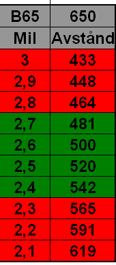 Publicerat Januari 24, 201016 yr Jag har gjort ett kort för mätning på varje mål som är beräknade att mäta med Zeissen på 24x som ser ut så här Ny_bild.bmp Det gröna är inom rekommenderat avstånd och det röda utanför men det lilla jag testat visar att man måste vara väldigt noga när man mäter för att det ska fungera. Sedan har jag kikaren nollad på 300 och ett separat klick kort för att slippa ändra alla mätkort om man väljer någon annan laddning eller kaliber, det har 25 meters intervaller upp till 500 sedan 10 meters till 650 Tycker du det verkar användbart kan jag maila samtliga kort om jag får en adress.
