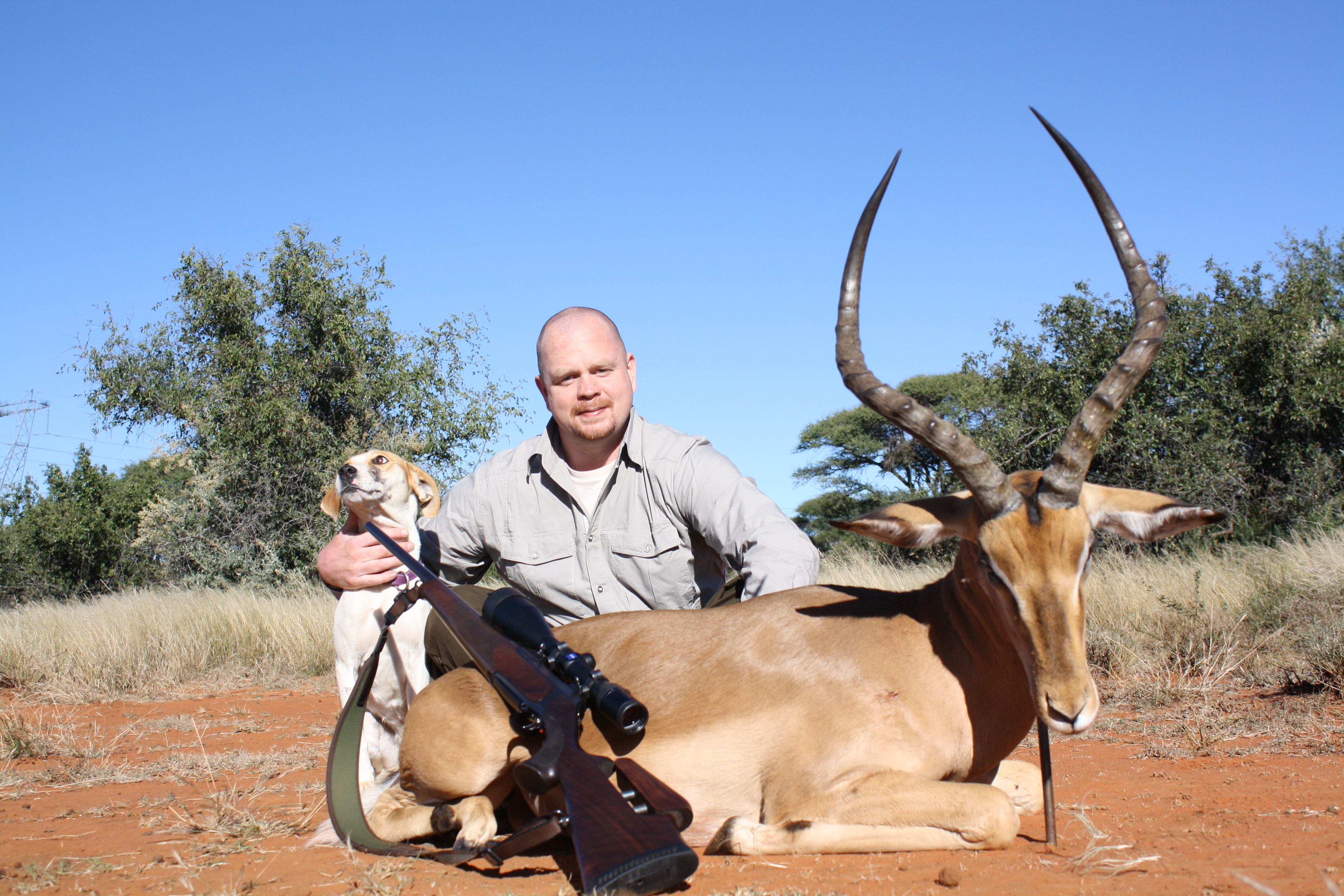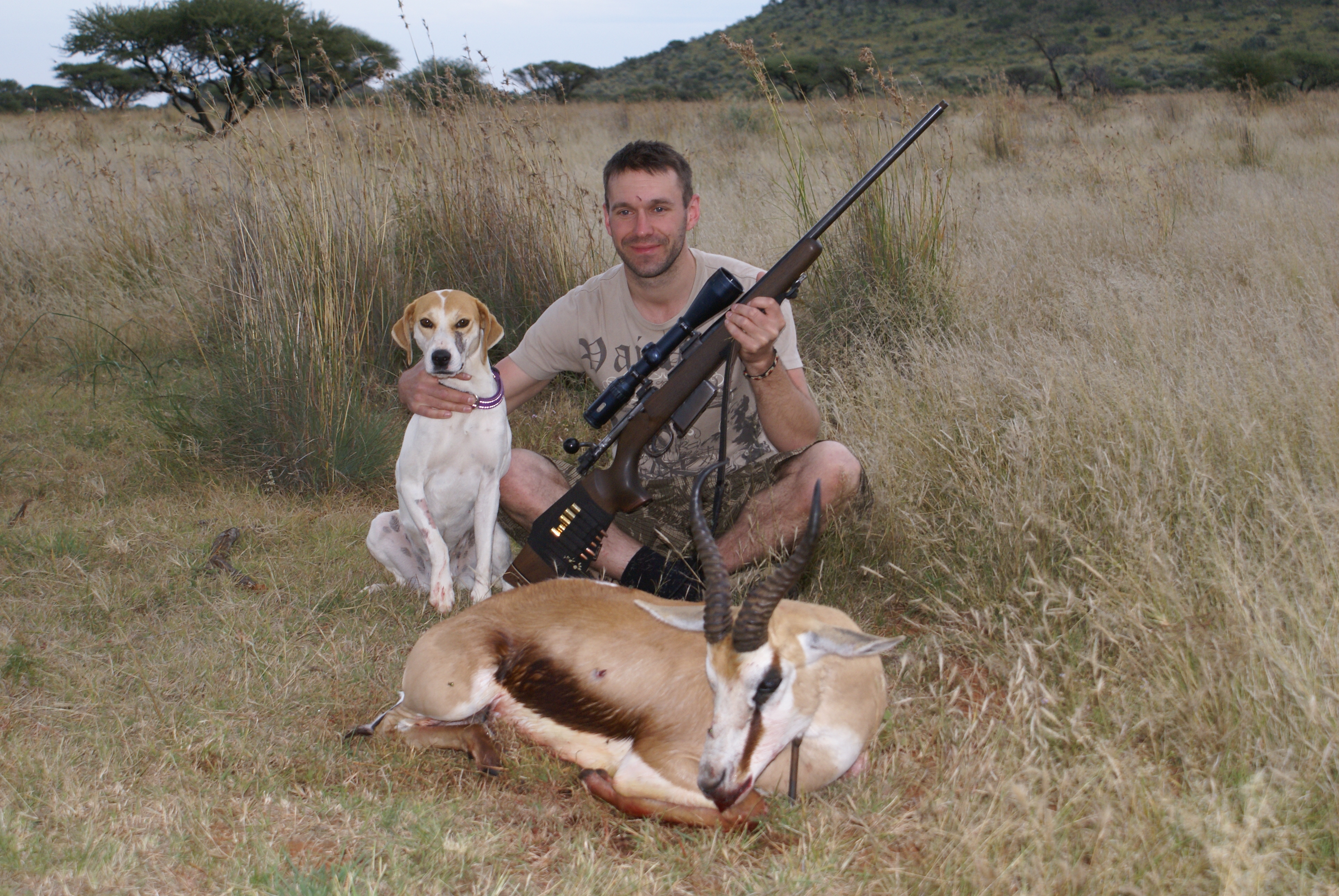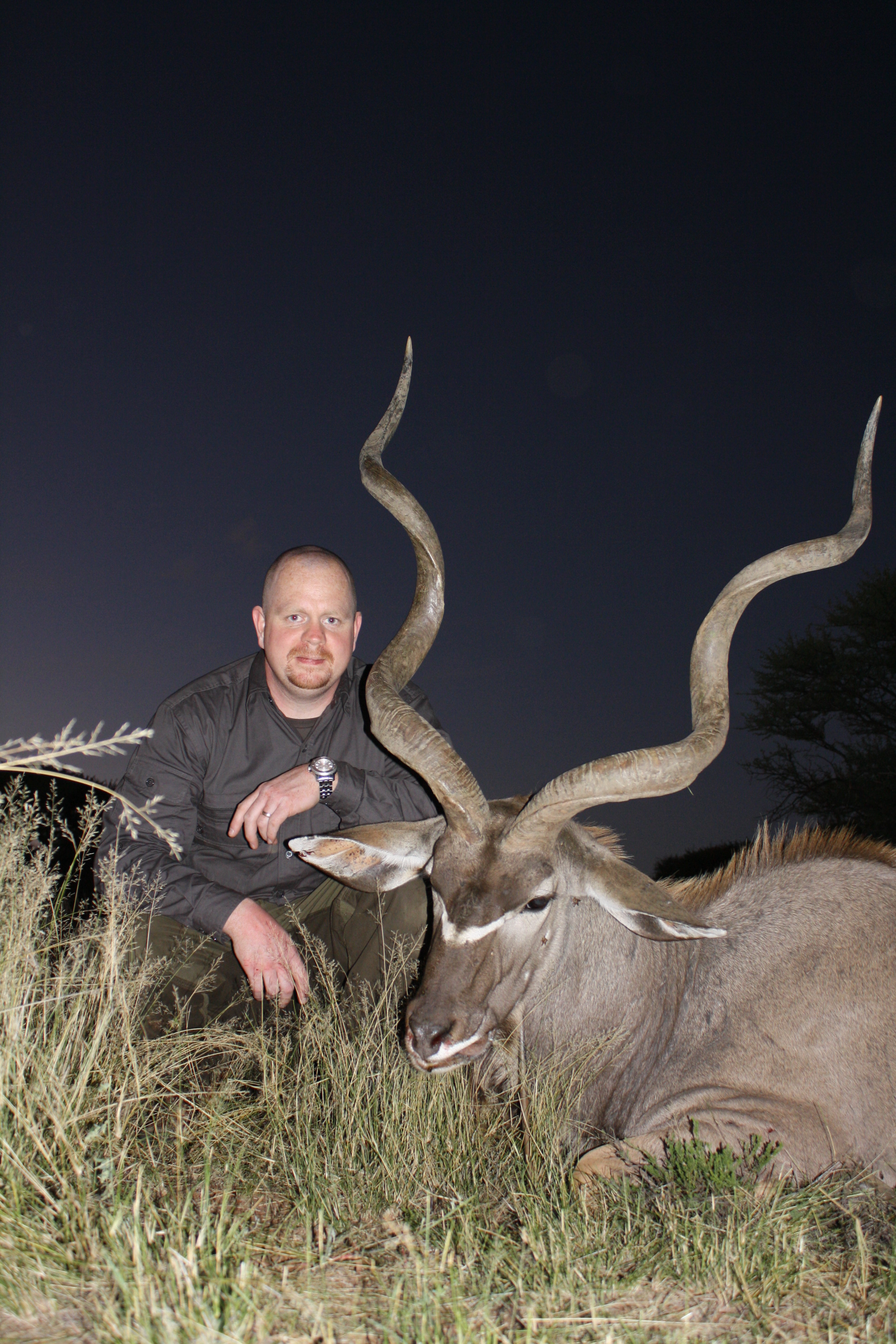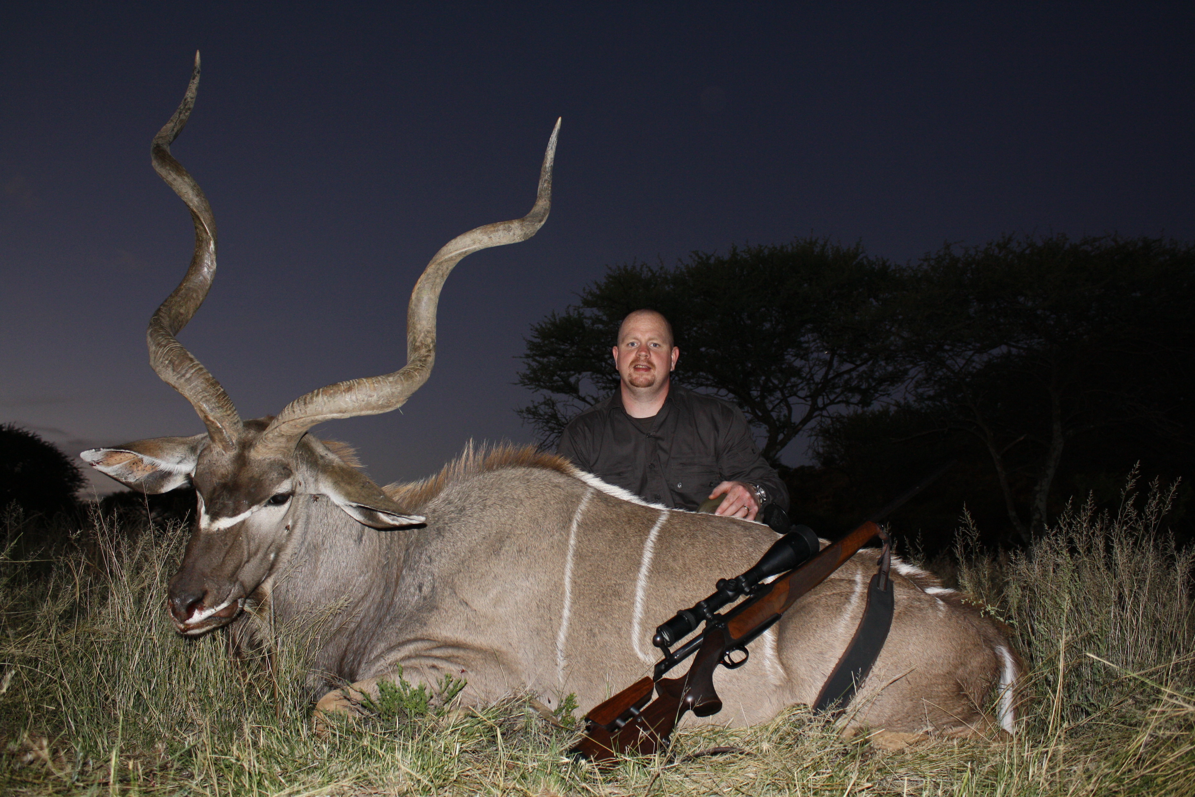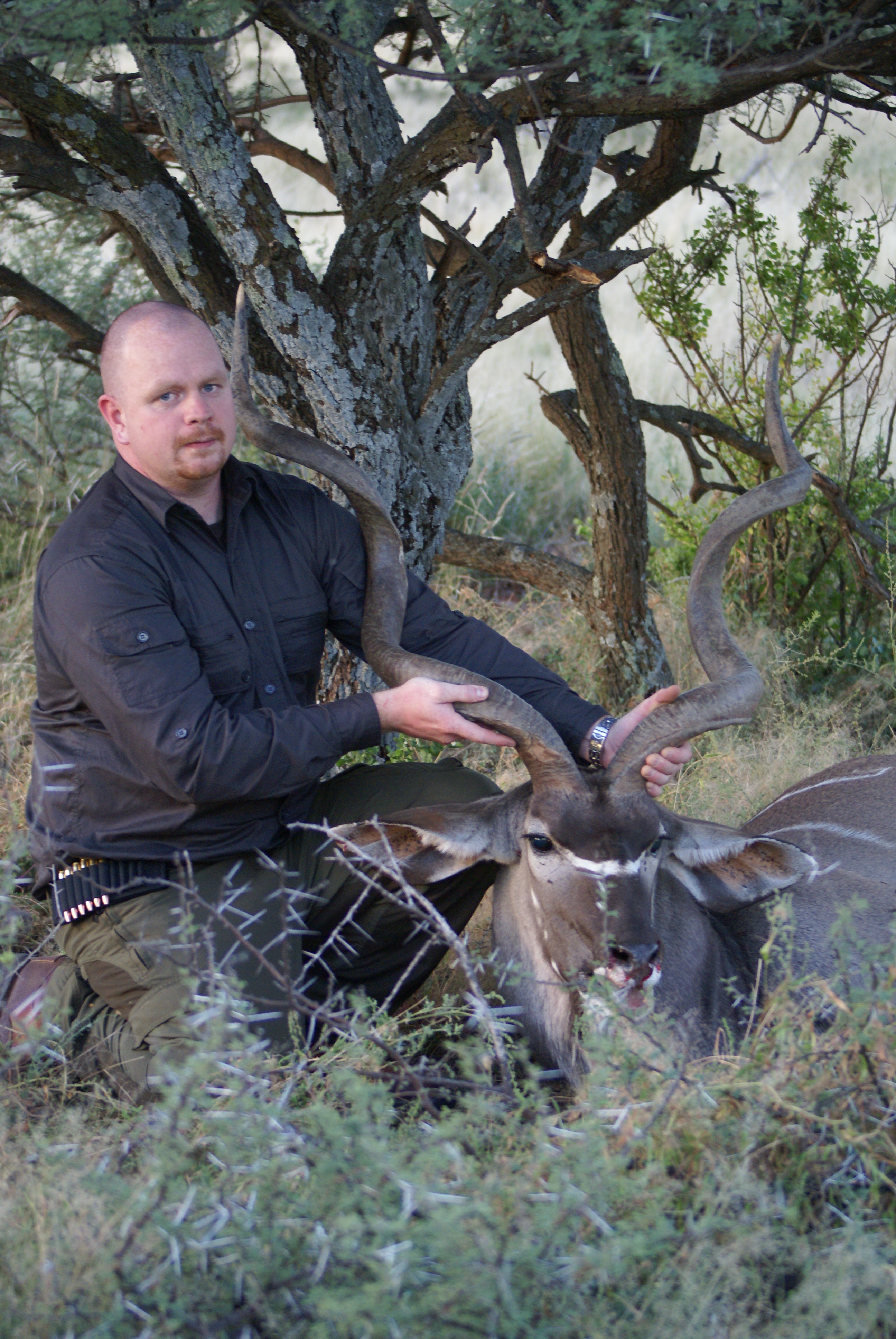 Publicerat Maj 25, 201015 yr 2010-05-102010-05-11Min resa började på arlanda kl. 16.00.Efter drygt två timmar var vi i Zûrich för en kort transfer till Johannesburg. Efter drygt tio timmars sömnlös flygning väntade en tre timmar lång paus i Johannesburg.Två och en halv timmes propellerflyg senare möttes vi av John på flygplatsen i Kimberly.Han hjälpte mig med vapen mm och sedan bar det av till Amakulu.Väl framme på farmen möttes vi av hela personalen som stod uppställda utanför entrégrinden.Det skakades händer och vi möttes av idel leenden.Vi drack en välkomstdrink och gick sedan för att titta runt och packa upp våra saker.Sedan var det dags för skjutbanan.. Tre skott på 100 meter för att se att allt fortfarande stämde med bössan. Sedan åkte vi runt lite nära farmen för att se om vi kunde få se några djur på kvällen. Vi såg springbock, Kudu, Impala, Sabel, Nyala mm mm.Kvällen spenderades framför brasan med gin&tonic, biltong och andra snacks i sällskap med John och Hettie m.fl.Morgonen efter möttes vi för frukost kl. 06.15.Efter det åkte vi ut med landcruisern på jakt. Vi körde några kilometer ut på savannen och ställde bilen bakom en kopje. Sedan spenderade vi resten av dagen till fots. Zebra var det första vi inriktade oss på då dom är ganska svårjagade. Dom trivs i öppen terräng och det är verkligen inte lätt att komma dom nära alla gånger.Under dagen såg vi mängder med djur. Bland annat giraffer.Mitt på dagen smög vi nära en ensam springbock-ram. Den närmade sig oss och jag la upp bössan på benstödet. Ena benet gled undan och jag bommade springbocken helt. Den hoppade omkring som tokig en stund och ställde sig sedan på 300 meter och stirrade på oss.Pinsamt då avståndet var ca. 90 meter. Men jag lärde mig att hålla vikten jämt på stödet därefter.Ett par ansmygningar på springbock blev det men inga fler avlossade skott mot dessa.När det började närma sig skymning gav vi upp för dagen.Vi satte oss i bilen och började röra oss hemmåt.Sam såg då en grupp Kudu på toppen av ett berg och John frågade om jag ville ta en klättring för att se. Självklart.Vi klättrade upp över berget och på andra sidan såg vi en grupp med två hanar och tre honor. Den största hanen hade fullt upp med att sniffa på en hona och vi smög oss närmare. Jag la upp bössan på ca. 230 meter, men det kändes inte tryggt då jag skjöt i nedförslutning. Så vi klättrade tyst ner hela vägen och smög oss nära. På 150 meter lade jag upp bössan igen. Lät skottet gå. Kudun rusade iväg och försvann utan mycket till tecken på träff. Efter en kvart hittade vi den ligga under ett träd och titta omkring sig. Jag sköt ett skott till och den suckade och föll ihop.Väl framme visade det sig att första skottet satt mitt i bogen och genom hjärtat. Ändå levde den när vi kom fram.En ståtlig Kudu. John gissade att den låg på drygt 50 tum och att det var den största som skjutits på området.Mitt första Afrikanska vilt var nu skjutet och enligt tradition så fick jag blodet från djuret i ansiktet och fick inte tvätta bort det förrän John gav tillstånd till detta. (”Men jag gillar Gin&Tonic så med lite tur får du tvätta dig i kväll” skrattade han)Nu följde fotografering.När vi sedan skulle lasta Kudun så märkte vi att vinschen inte fungerade. Vi fick kalla på bärhjälp och lastade Kudun för hand. Sedan följde en nervpirrande tur genom bäcksvart savann.Hemma väntade en jaktsnaps och sedan middag.Ett par gin&tonic senare var det läggdags. Frukost i morgon kl. 06.15 Med vänlig hälsning John Johnson Hjord