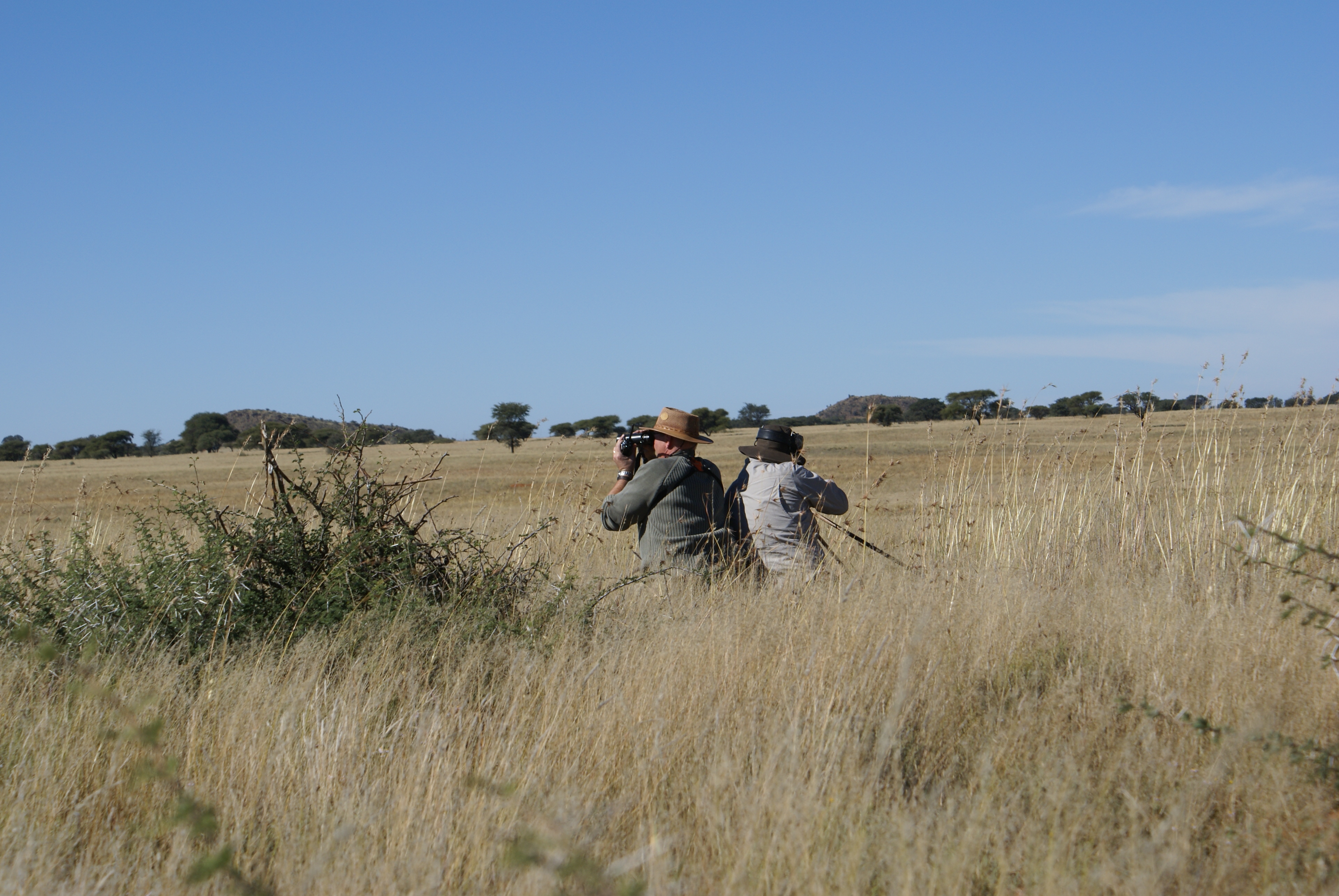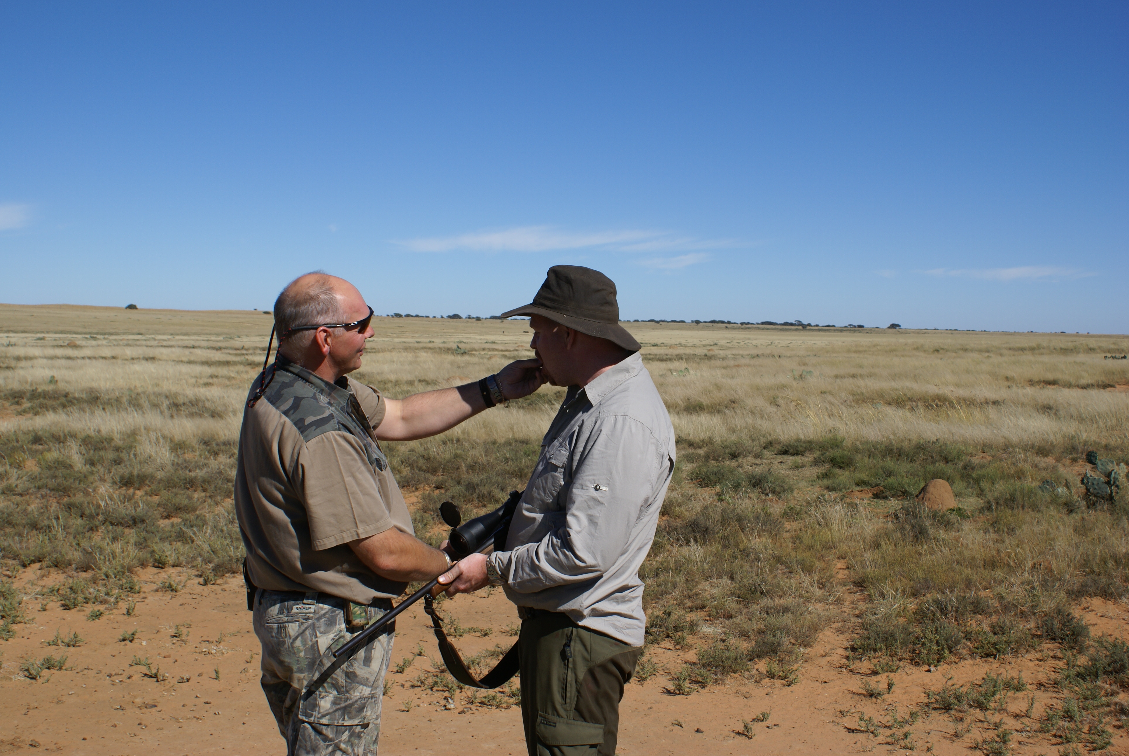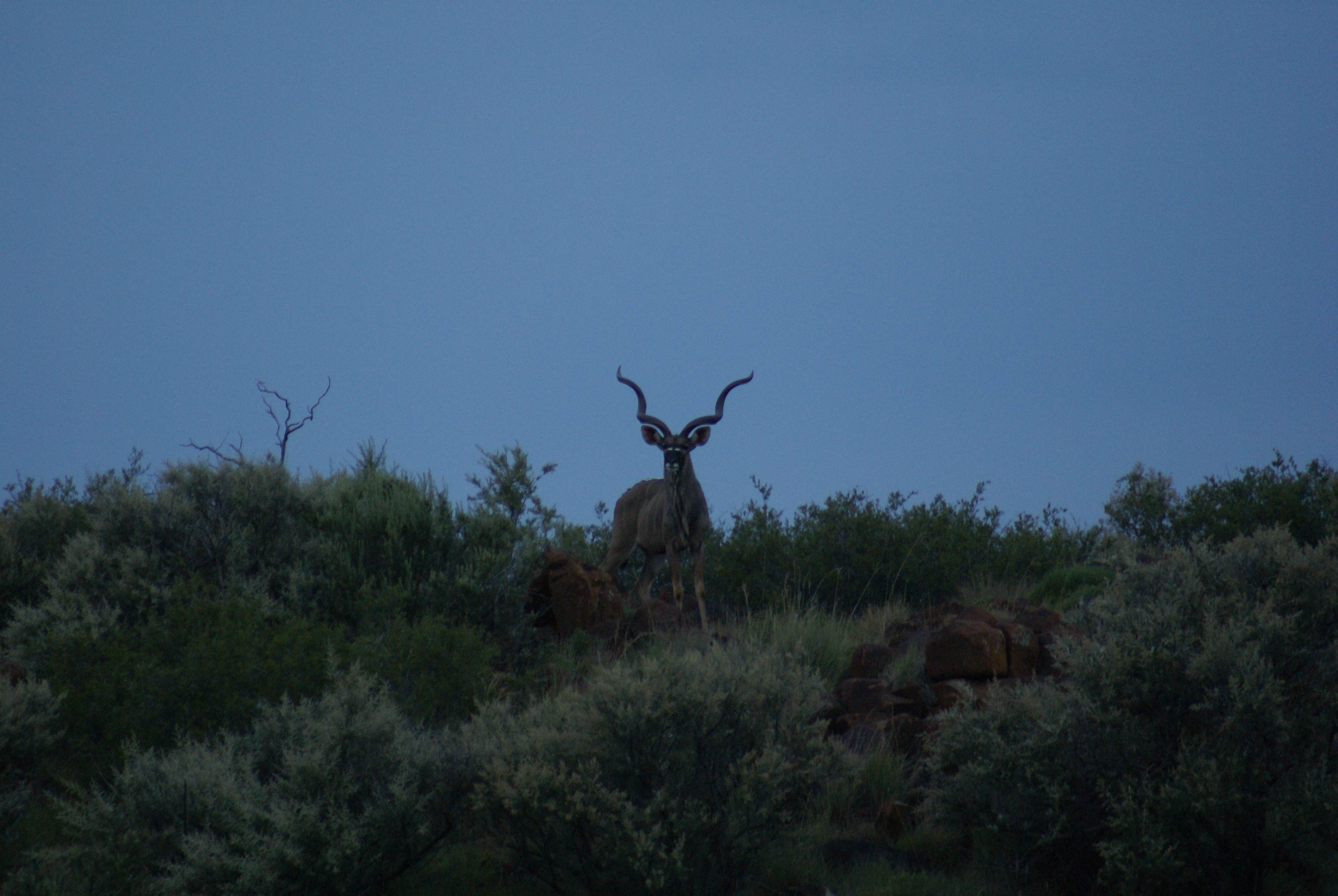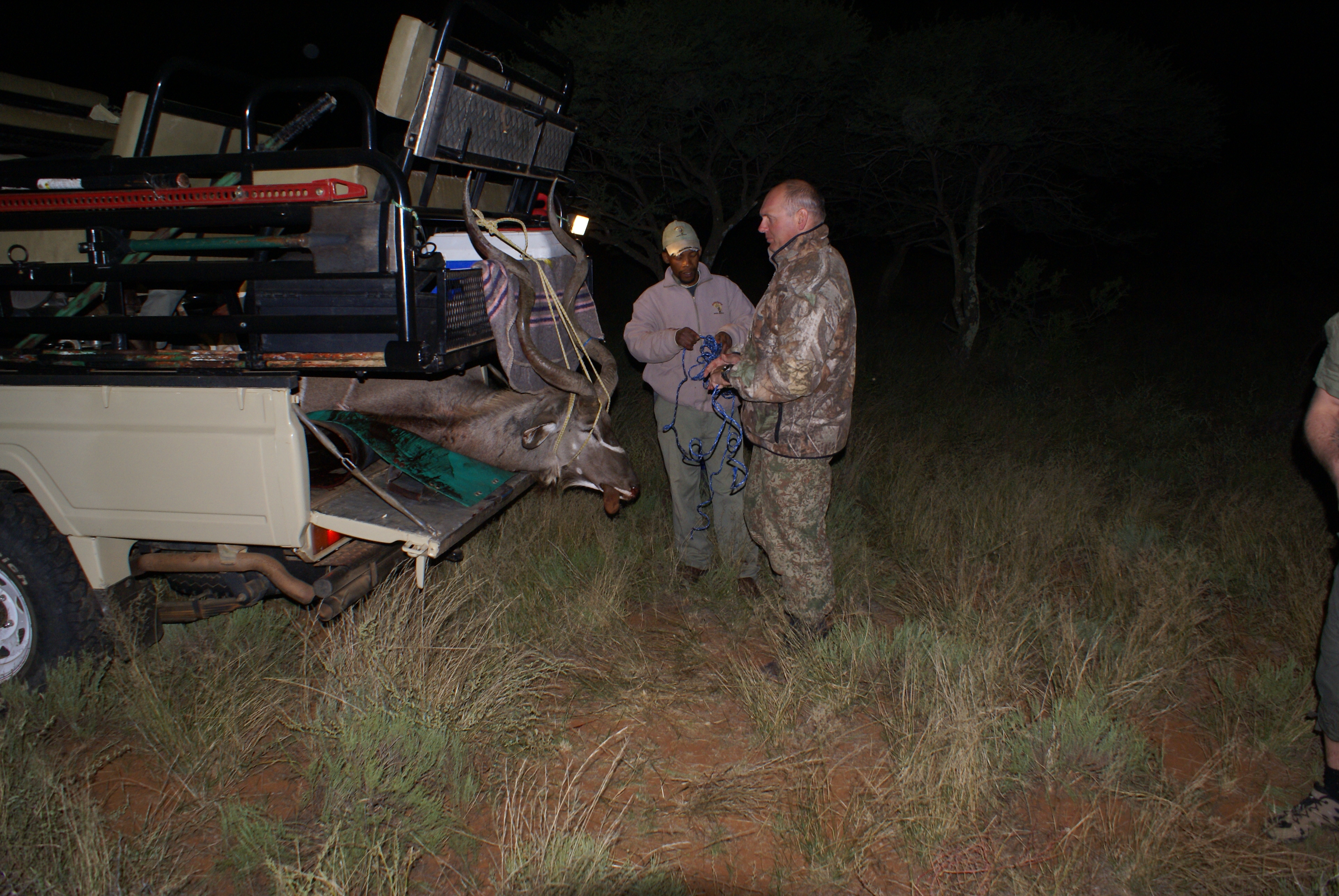 Publicerat Maj 25, 201015 yr 2010-05-102010-05-11Min resa började på arlanda kl. 16.00.Efter drygt två timmar var vi i Zûrich för en kort transfer till Johannesburg. Efter drygt tio timmars sömnlös flygning väntade en tre timmar lång paus i Johannesburg.Två och en halv timmes propellerflyg senare möttes vi av John på flygplatsen i Kimberly.Han hjälpte mig med vapen mm och sedan bar det av till Amakulu.Väl framme på farmen möttes vi av hela personalen som stod uppställda utanför entrégrinden.Det skakades händer och vi möttes av idel leenden.Vi drack en välkomstdrink och gick sedan för att titta runt och packa upp våra saker.Sedan var det dags för skjutbanan.. Tre skott på 100 meter för att se att allt fortfarande stämde med bössan. Sedan åkte vi runt lite nära farmen för att se om vi kunde få se några djur på kvällen. Vi såg springbock, Kudu, Impala, Sabel, Nyala mm mm.Kvällen spenderades framför brasan med gin&tonic, biltong och andra snacks i sällskap med John och Hettie m.fl.Morgonen efter möttes vi för frukost kl. 06.15.Efter det åkte vi ut med landcruisern på jakt. Vi körde några kilometer ut på savannen och ställde bilen bakom en kopje. Sedan spenderade vi resten av dagen till fots. Zebra var det första vi inriktade oss på då dom är ganska svårjagade. Dom trivs i öppen terräng och det är verkligen inte lätt att komma dom nära alla gånger.Under dagen såg vi mängder med djur. Bland annat giraffer.Mitt på dagen smög vi nära en ensam springbock-ram. Den närmade sig oss och jag la upp bössan på benstödet. Ena benet gled undan och jag bommade springbocken helt. Den hoppade omkring som tokig en stund och ställde sig sedan på 300 meter och stirrade på oss.Pinsamt då avståndet var ca. 90 meter. Men jag lärde mig att hålla vikten jämt på stödet därefter.Ett par ansmygningar på springbock blev det men inga fler avlossade skott mot dessa.När det började närma sig skymning gav vi upp för dagen.Vi satte oss i bilen och började röra oss hemmåt.Sam såg då en grupp Kudu på toppen av ett berg och John frågade om jag ville ta en klättring för att se. Självklart.Vi klättrade upp över berget och på andra sidan såg vi en grupp med två hanar och tre honor. Den största hanen hade fullt upp med att sniffa på en hona och vi smög oss närmare. Jag la upp bössan på ca. 230 meter, men det kändes inte tryggt då jag skjöt i nedförslutning. Så vi klättrade tyst ner hela vägen och smög oss nära. På 150 meter lade jag upp bössan igen. Lät skottet gå. Kudun rusade iväg och försvann utan mycket till tecken på träff. Efter en kvart hittade vi den ligga under ett träd och titta omkring sig. Jag sköt ett skott till och den suckade och föll ihop.Väl framme visade det sig att första skottet satt mitt i bogen och genom hjärtat. Ändå levde den när vi kom fram.En ståtlig Kudu. John gissade att den låg på drygt 50 tum och att det var den största som skjutits på området.Mitt första Afrikanska vilt var nu skjutet och enligt tradition så fick jag blodet från djuret i ansiktet och fick inte tvätta bort det förrän John gav tillstånd till detta. (”Men jag gillar Gin&Tonic så med lite tur får du tvätta dig i kväll” skrattade han)Nu följde fotografering.När vi sedan skulle lasta Kudun så märkte vi att vinschen inte fungerade. Vi fick kalla på bärhjälp och lastade Kudun för hand. Sedan följde en nervpirrande tur genom bäcksvart savann.Hemma väntade en jaktsnaps och sedan middag.Ett par gin&tonic senare var det läggdags. Frukost i morgon kl. 06.15 Med vänlig hälsning John Johnson Hjord