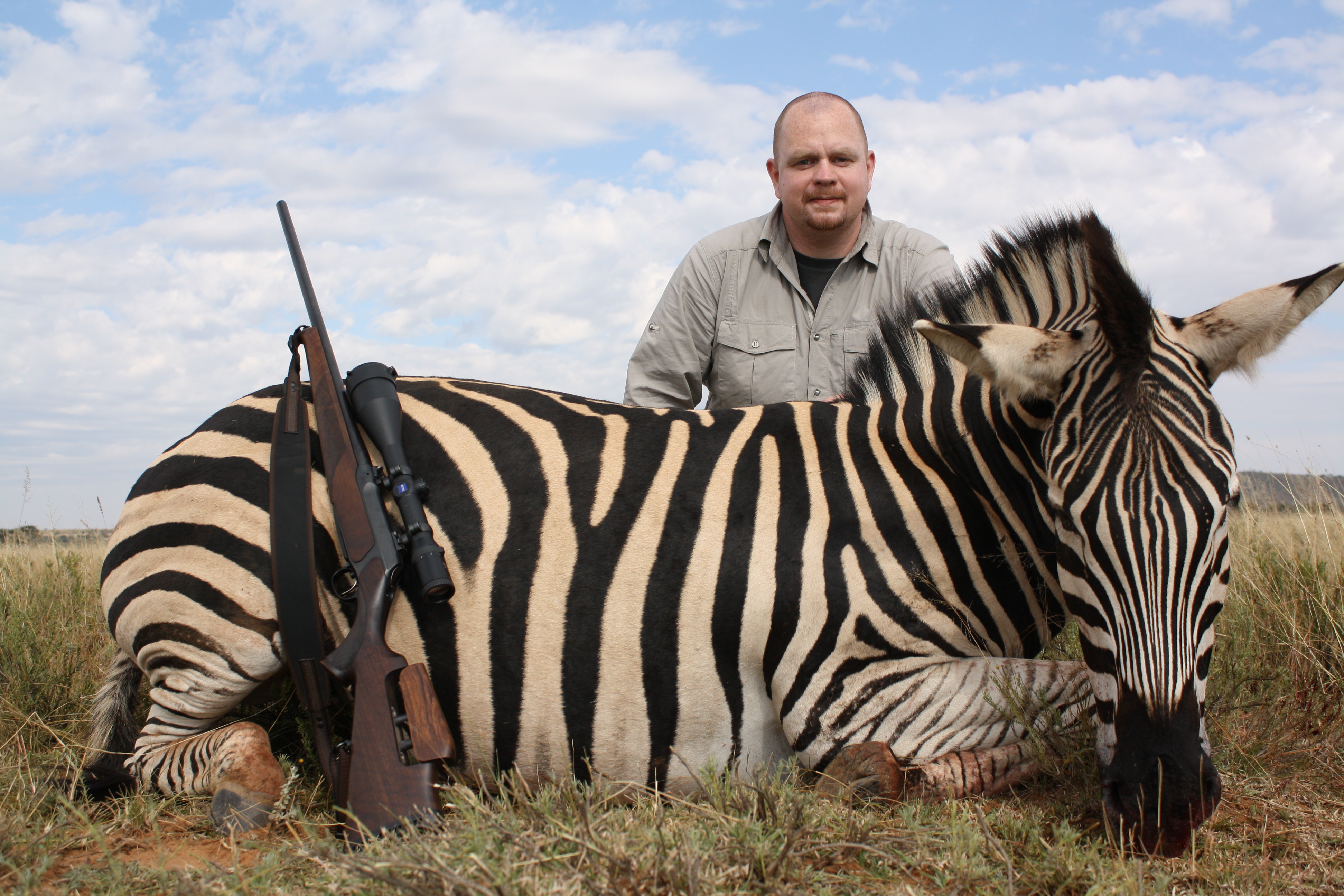 Publicerat Maj 26, 201015 yr Författare 2010-05-14Upp 06.00. Snabb frukost.Klockan 07.00 bär det iväg. Det regnar lite och gräset är blött. Vi tar oss till den högsta toppen och kikarspanar i soluppgången. Jag blir mer och mer imponerad av John och Sams ögon, men denna gång var det jag som såg zebrorna först.Vi gick flera kilometer. Vi kröp, sprang och klättrade över savannen. Efter mycket om och men kom vi fram till en liten glänta. Där ser vi hur zebrorna springer ifrån oss. Ledda av sitt galna ledarsto. Men efter en stund började de sakta röra sig emot oss igen. Upp och ner med bössan flera gånger men jag fick aldrig någon ren skottchans.Tillslut försvann dom igen.Dags för kaffe, skorpa och en ny plan.Sam som åkt iväg med landcruisern rapporterade att han såg zebrorna fortfarande på väg tillbaka.Vi var inte sena att ta tillvara den informationen. John rev ur nedre delen av en taggbuske och vi gjorde ett litet gömsle. Där satt vi och väntade en stund på zebrornas nästa drag.Vi ser zebrorna springa omkring länge på runt 600 meters håll och vi var nära att ge upp och prova ett annat område istället. ”The zebra is just crazy here”Men då vänder Zebrorna och springer åt vårt håll.Jag gör mig snabbt skjutklar. John säger ”It would be great if you could take out the first one”Det var uppenbart att dom ville ge en annan zebra en chans att leda flocken nu.Zebrorna kommer in på runt 150 meter och dom stannar till. Ledaren ställer sig 20 meter framför de andra. Jag får snabbt in henne i kikaren. Jag ser triangeln som ränderna bildar i korset och släpper skottet. Hon vänder och springer nästan 200 meter innan hon faller ihop. Men hon kommer upp igen och springer ytterliggare nästan 150 meter. John har sett att skottet sitter bra så jag sitter kvar en stund innan jag börjar röra mig mot zebran. När jag kommer fram ligger ett mycket stort och fint sto där. Skottet satt precis där det skulle. När vi tar ur djuret ser vi att jag skjutit itu hjärtat i två delar och även lungan. Ändå sprang hon nära 400 meter!John hälsar och tackar från Sam att jag skjutit ledarstot. Nu kommer en ny zebra snart få chansen att leda flocken.Kontrac kommer vartefter med bilen och vi riggar för trofébilder.Sam hittar tomhylsan. Jag har sparat alla.Tillbaka på farmen blev det lunch.Fruktcocktail med färsk frukt och müsliJuice och kaffeToast, sylt och ostStekt ägg, bacon, hemgjord korv på warthog och grillad tomat.Arne och jag tog en promenad till slakteriet. Kontrac hade hittat kulorna från kudun och zebran.Efter lunch åkte vi till ett nytt ställe. På den marken var ett staket det enda som skiljde oss från vilda lejon.Nära oss fanns också vilda bufflar så det blev till att ta det varligt.När vi kliver av har både jag och Arne vapen med oss. Jag vill att vi i första hand koncentrerar oss på Arnes springbock. Men kommer det en warthog vill jag också vara beredd.Inom kort har vi hittat en fin springbock. Den står efter en ansmygning på ca 130 meter.Arne får instruktioner och han låter skottet gå.John ser att skottet träffar men djuret lägger sig inte. Han frågar om Arne vill skjuta igen. Men Arne är lite skärrad och låter John ta bössanMen avståndet har nu ökat till drygt 300 meter och John tar upp jakten för att komma närmare.Men vi hittar inte djuret. Efter lite radiokrångel kommer Sam med Laika (Johns hund) som tar upp spåret.Vi hittar springbocken. Arne hade därmed nedlagt sitt första vilt i livet.Samma procedur som för mig. Blod i ansiktet och äta lever. Och hjärtliga gratulationer ifrån oss alla.Vi hade med oss en ung kille från den marken som hette Joseph. John och Sam skulle utbilda honom till tracker.Vi tog ur springbocken och tog trofébilder till musiken från rytande lejon någon kilometer bort.Sedan hem för middag.Varmrätten var Solefish och vitt vin. / John Johnson Hjord