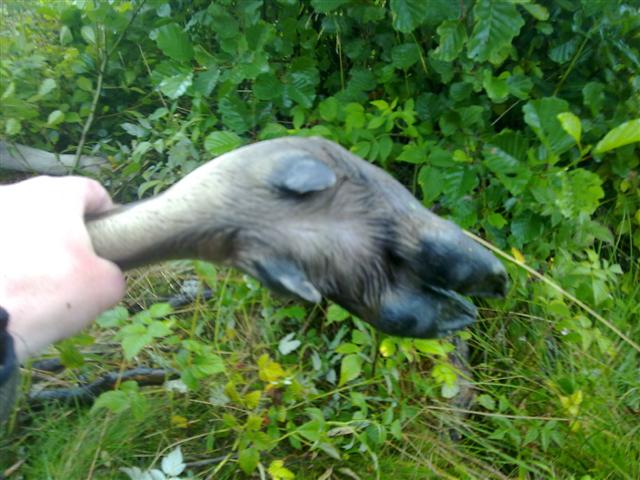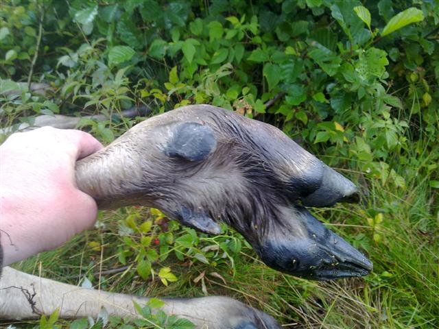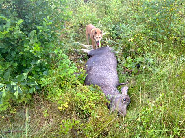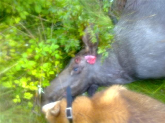 Publicerat Augusti 8, 201015 yr Fick samtal idag vid kl 08.00 om en älgolycka som inträffat vid ca kl 0230 vart en kraftig smäll ett horn och hår på kollisionsplatsen. Regnat ganska mycket sen olyckan när jag körde dit ösregnade det hade hellre åkt dit inatt men markägaren valde att vänta till morgonen så är det. Hittade bara hornet och en massa hår som de som vart där innan så jag plockade ut Nelly och visade henne platsen hon tog ett spår direkt och började spåra. Spårade ett tag men det kändes inte rätt älgen hade snurrat och snurrat precis som ett vanligt fodersök det kunde givetvis ha varit den påkörda men tyckte inte att det stämde. Så jag gick tillbaka och provade igen vid kollisionsplatsen hittade inget annat spår gick med Nelly i vägkanten och kollade 100 m bort från kollisionsplatsen markerade hon tydligt och började spåra denna gången gick det rakt ut lite mer likt en älg som blivit påkörd och har möjlighet att ta sig från platsen. Efter ca 500 m hör jag en älg springa iväg precis framför oss släpper direkt. Efter ca 200 m är hon ikapp skäller ett par skall men älgen drar vidare. Efter 1 km ungefär blir det stopp. kommer upp på ca 20 m på ett "Gudrunhygge" och får se älgen ser bara ryggen och huvudet ser att den är blodig i huvudet och en skinnbit saknas på halsen Nelly ligger på hårt och rör sig hela tiden men omöjligt at se henne i slyet så jag vågar inte skjuta. Efter några minuter får tjuren vittring av mig och springer iväg från mig såg förutom blodet i huvudet kry ut. Hoppade upp på en sten och kunde därifrån se den springa ca 200 m utan någon tendens till att halta. Berättade för dom övriga att det var rätt älg så de postade om och jag gick på igen men nu var den mer vaksam och gick bara riktigt tätt och var väldigt aggresiv mot Nelly. Efter ca 1h och 40 min och en total förflyttning på ca 4 km får jag läge och skjuter tjuren. Började titta lite mer noggrant efter ytterligare skador såg väl ingen annat konstigt direkt men efter en stund tycker jag att ena bakklöven ser konstig ut lyfter upp den då är den bruten under lättklöven kollar den andra också då är den bruten också. Så båda bakklövarna är brutna men den haltade inte och inga problem att trava ändå helt otroligt. Fick mig en riktig tankeställare tänk om den inte haft skadan i huvudet hade jag skjutit den då?