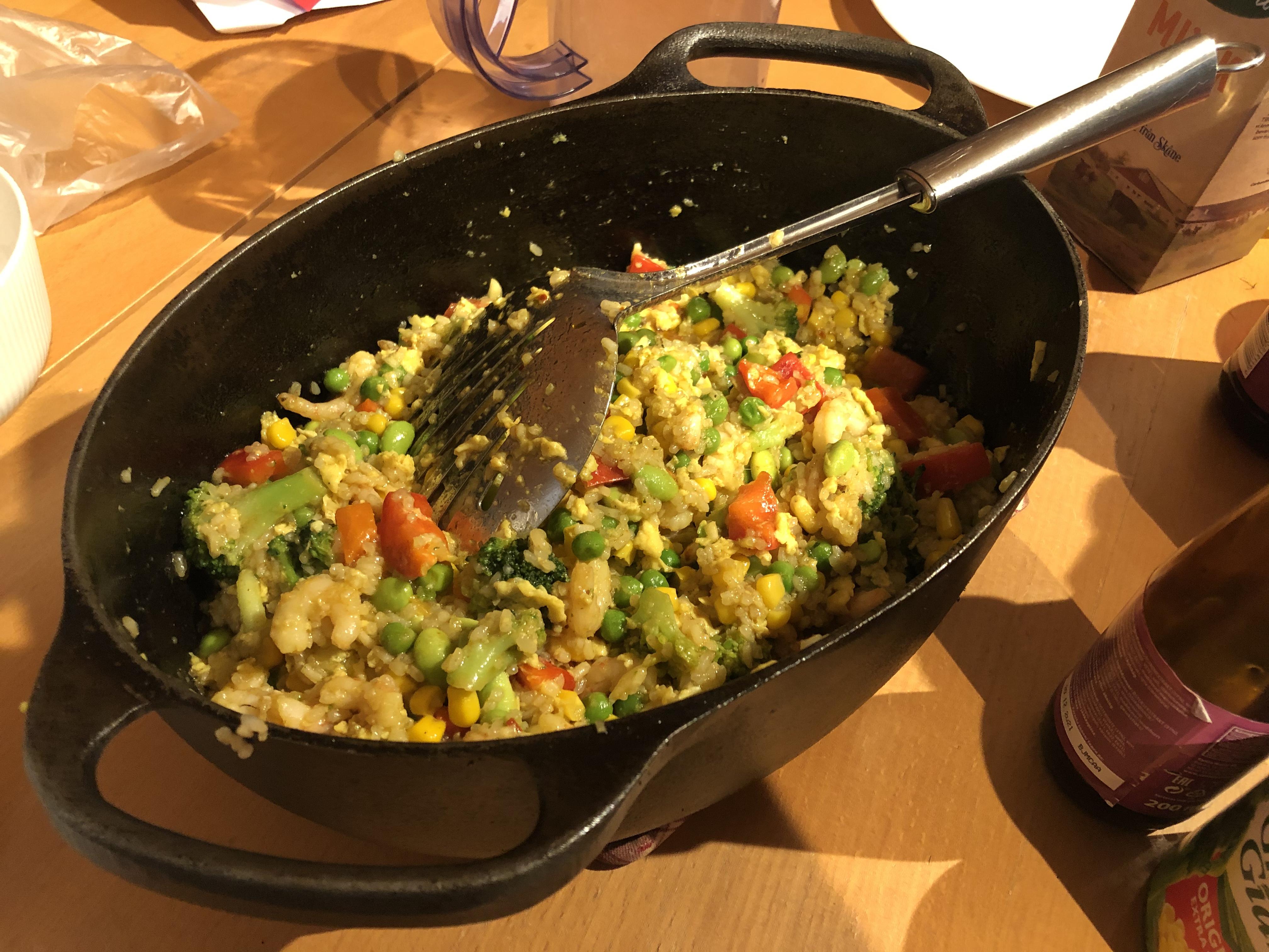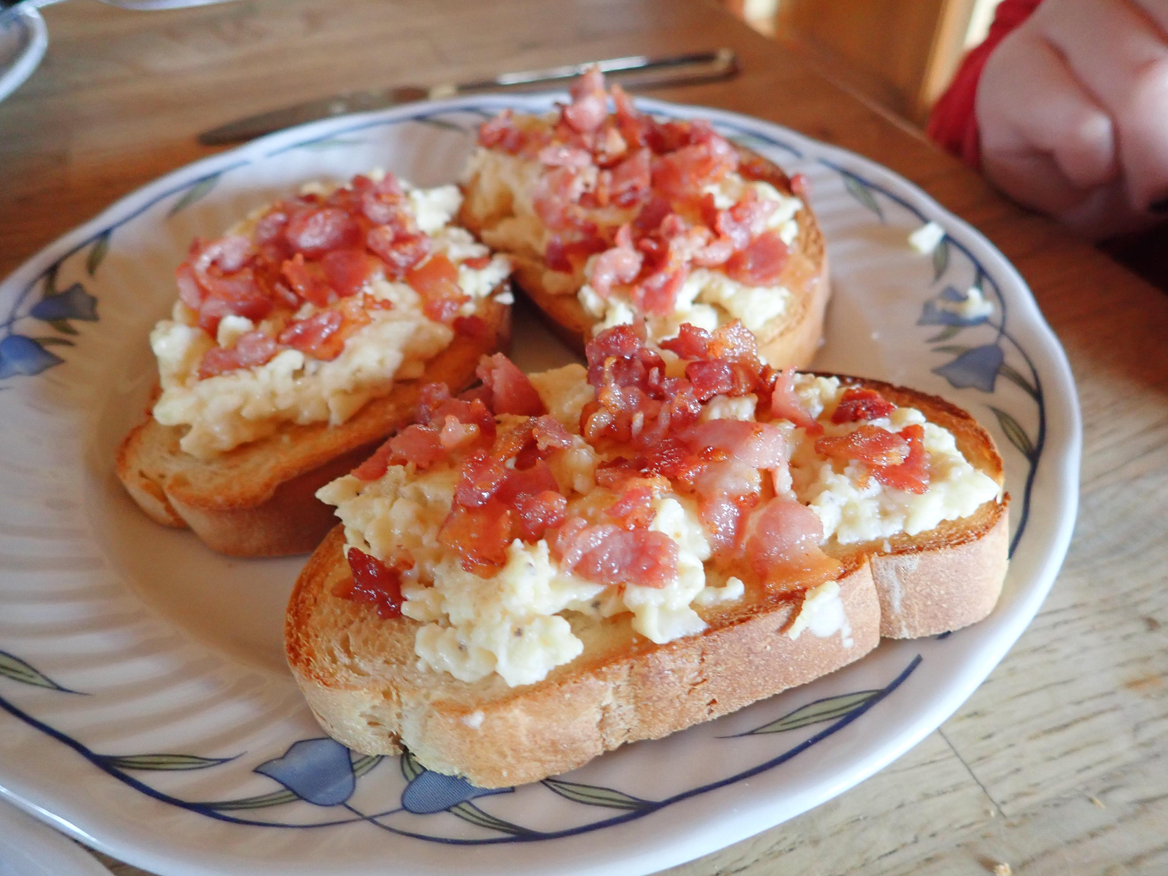 Publicerat Maj 7, 20205 yr Igår blev det rester till lunch. Klyftpotatis och älgfärsbiffar med en lättöl till maten. Middagen fick barnen ordna. Så de valde att göra äggröra med bacon som vi åt på hembakt rostad franska. 12-åringen skar franska, blandade ihop äggröresmeten medan 10-åringen skar och stekte bacon. Franskan rostade vi ugnen så de var klara samtidigt allihop. Skulle nog ha lättat upp det med lite sallad på sidan men jag var för hungrig plus att jag kom inte ihåg det förrän maten var klar och det är ju godast äta den direkt.