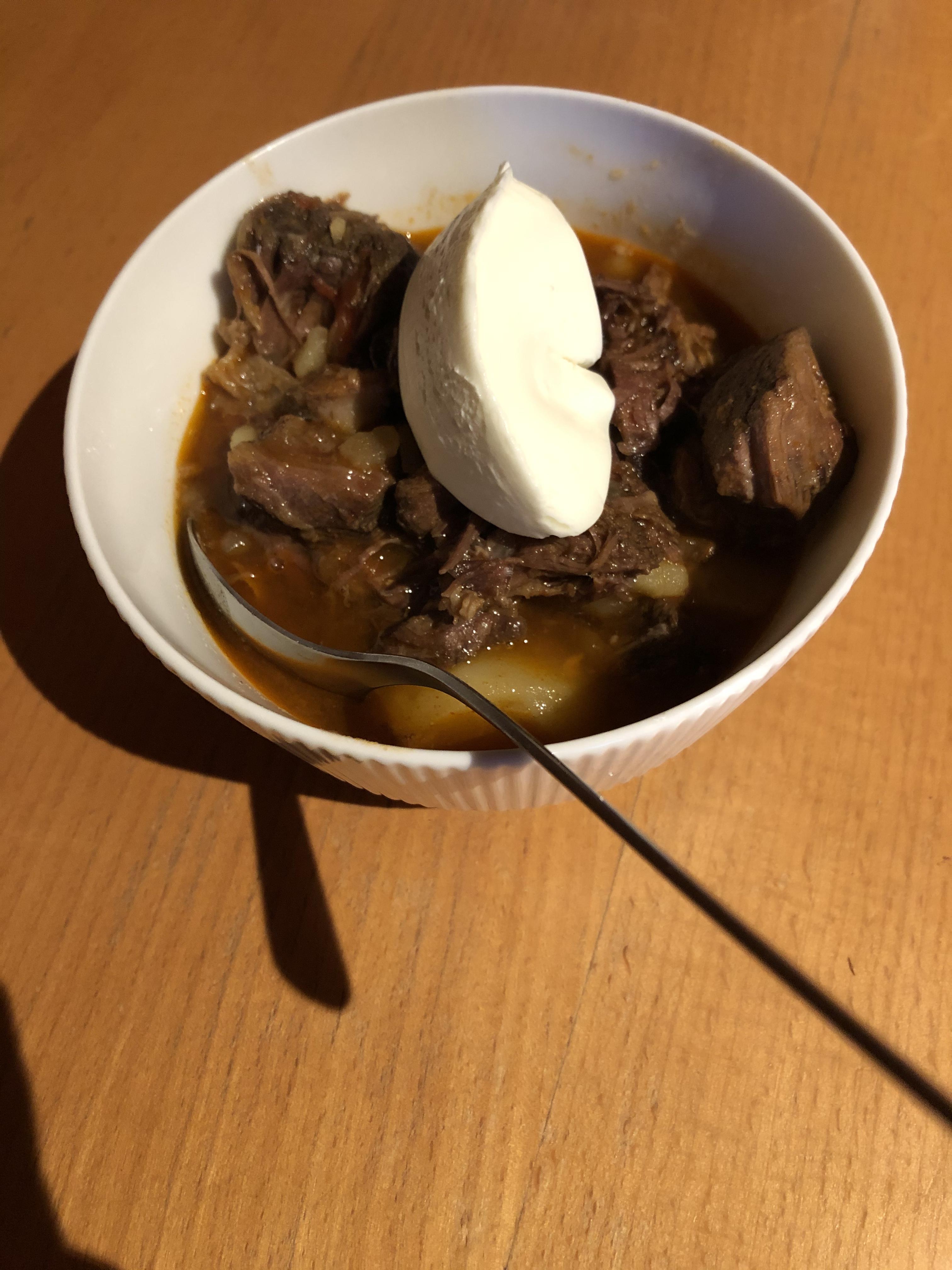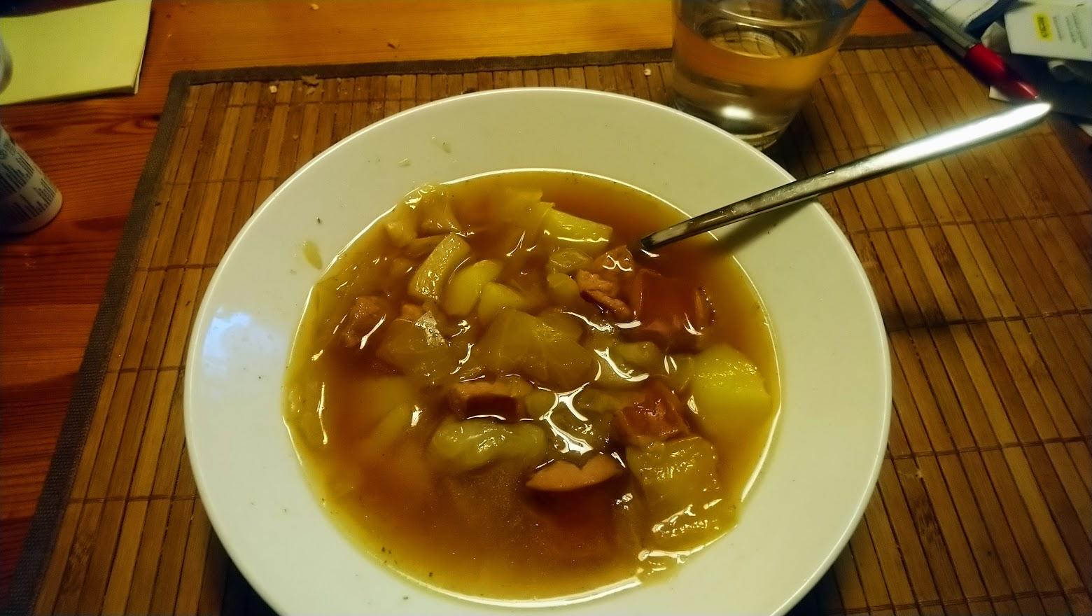 Publicerat Oktober 10, 20205 yr Älgköttsoppa med div. rotfrukter o ärtor. samt knäckebröd med ost, smör o mjölk.