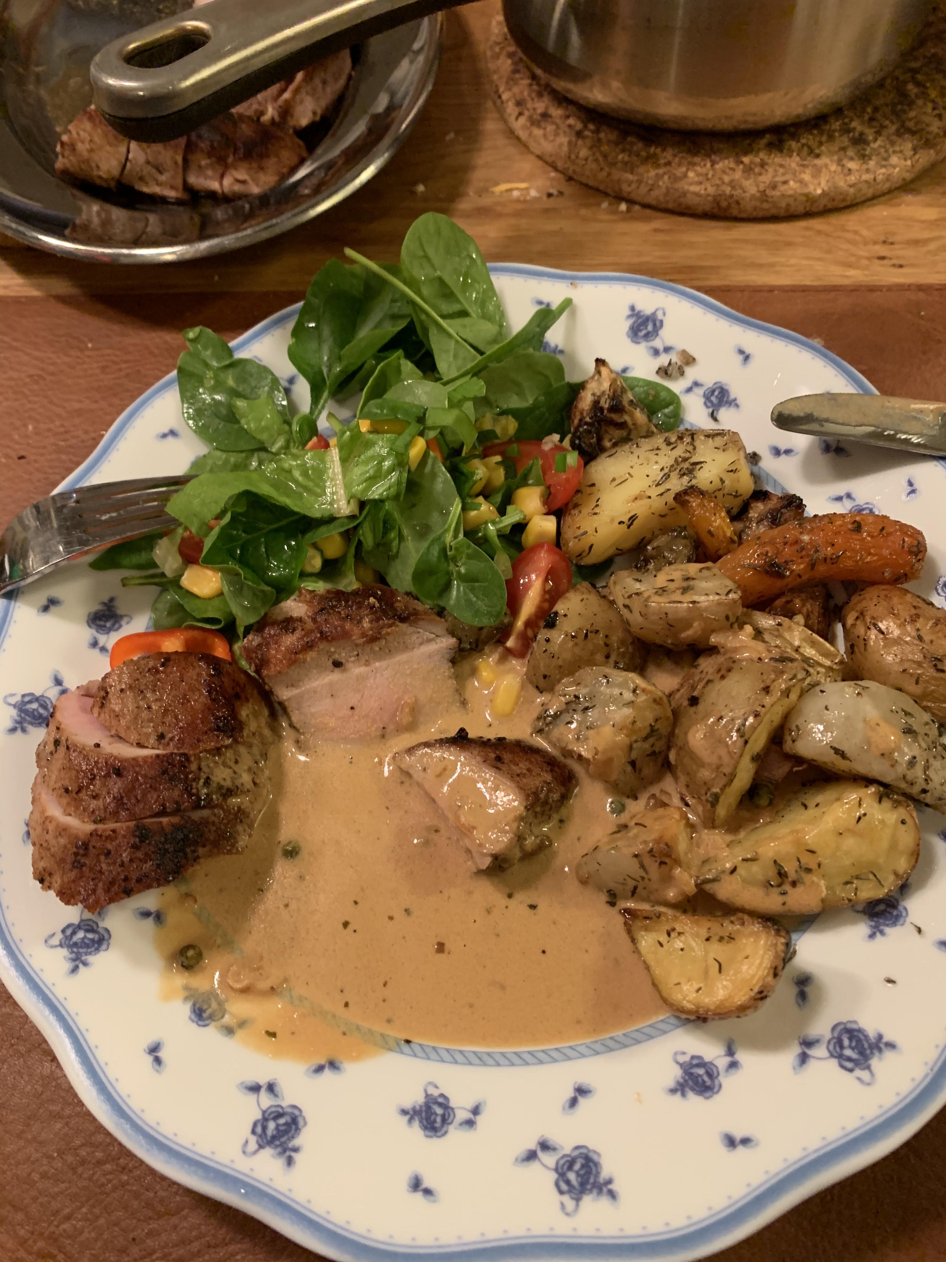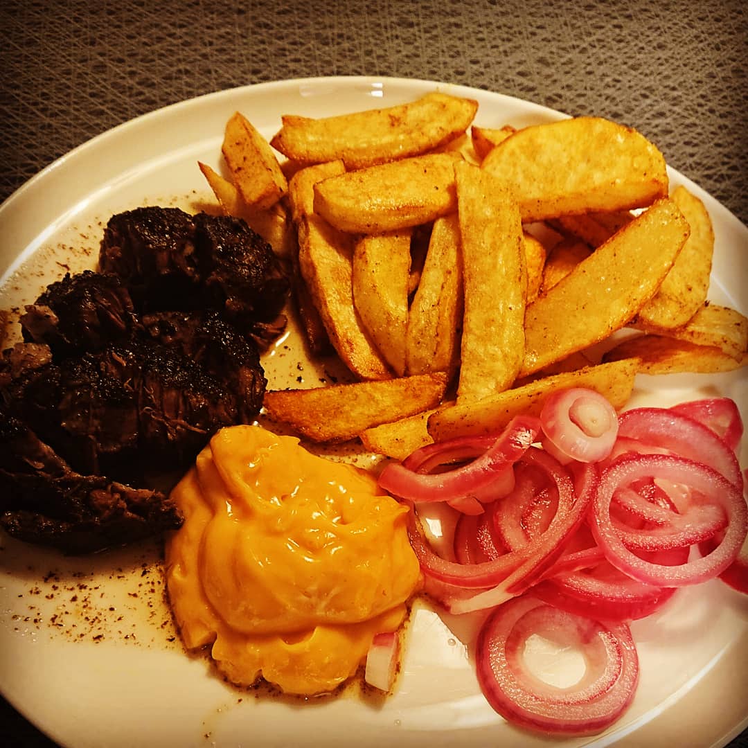 Publicerat November 20, 20205 yr Detta är en populär post. Ölbräserade vildsvinskinder, chipotlehet ugnsrostad potatis, sriracha-sojamajjo och picklad rödlök.