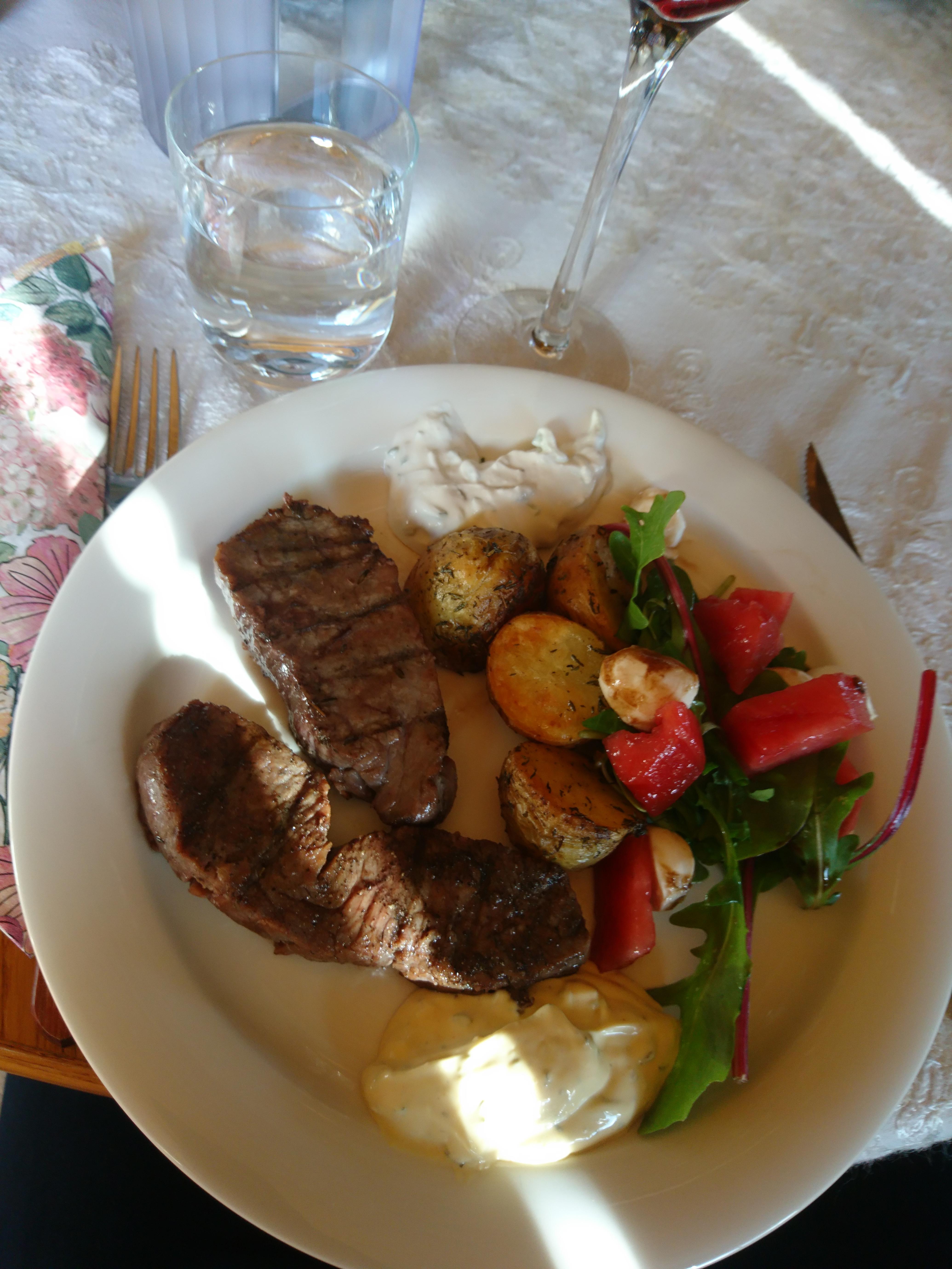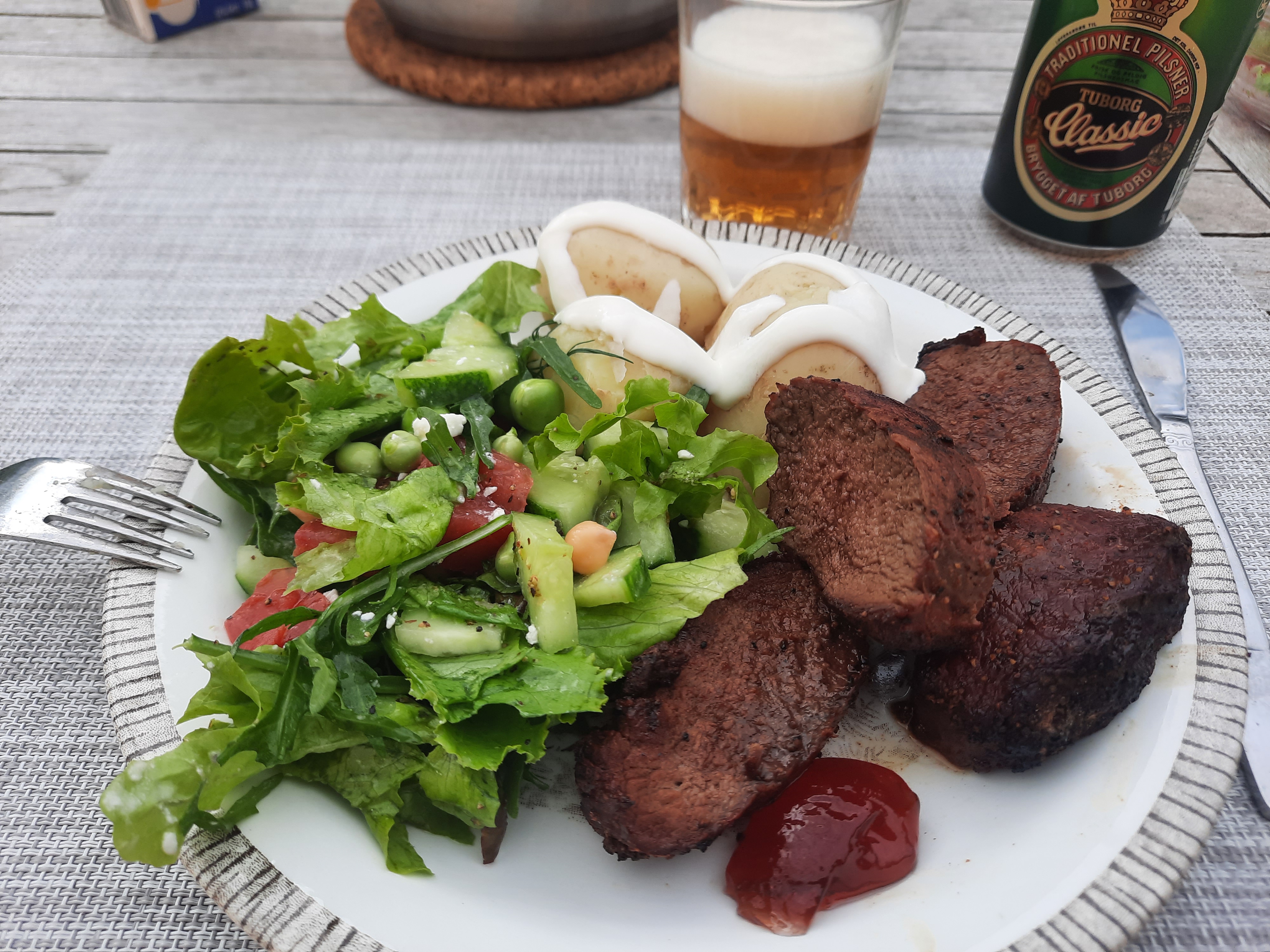 Publicerat Juli 31, 20223 yr Grillad hängmörad dovrygg, färska potäter och blandat grönt från trädgården. Nersköljt med en kall.