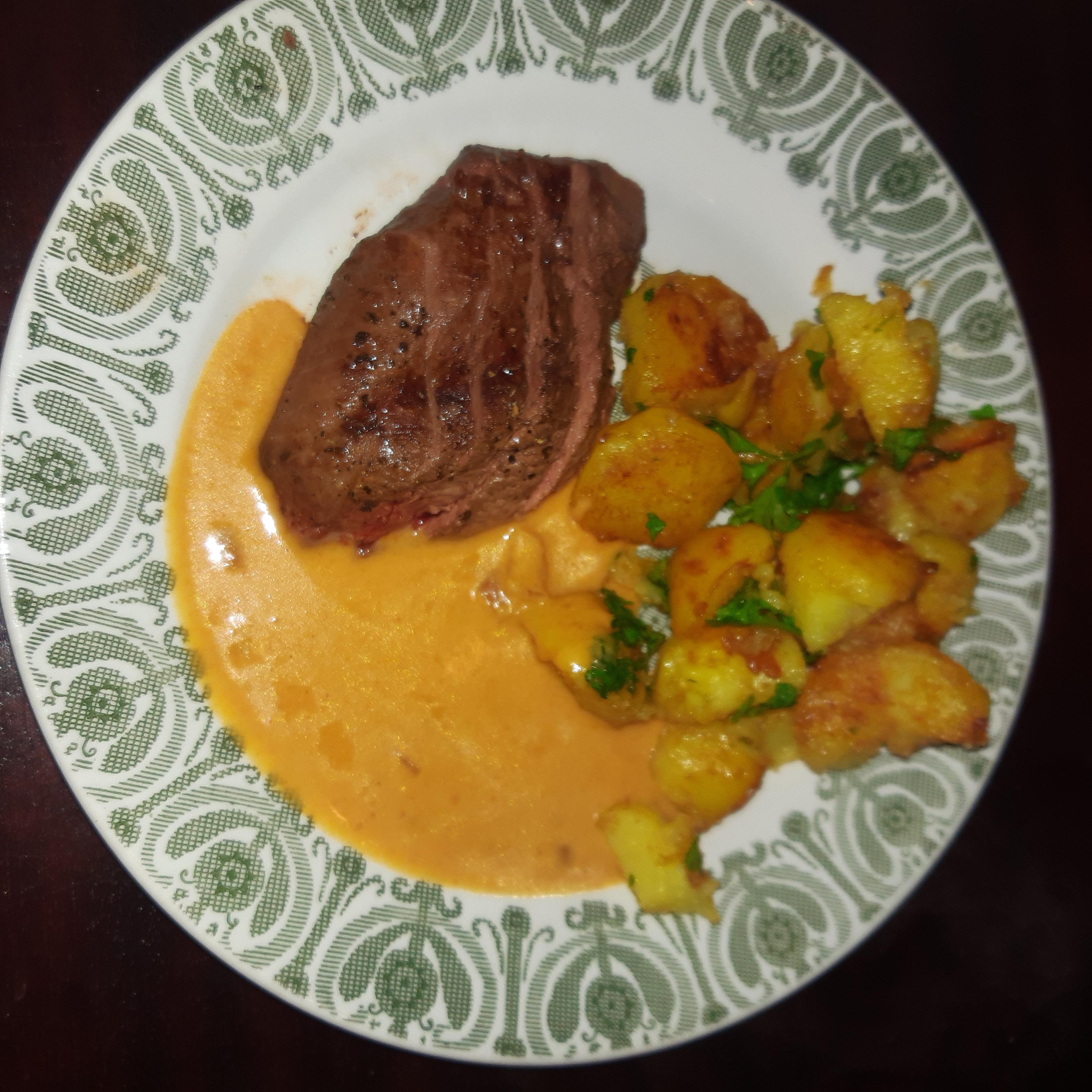Publicerat Oktober 18, 20241 yr Detta är en populär post. Stekt gräsandsfile, förkokt stekt potatatis, konjaksås, persilja, havtornsgele...