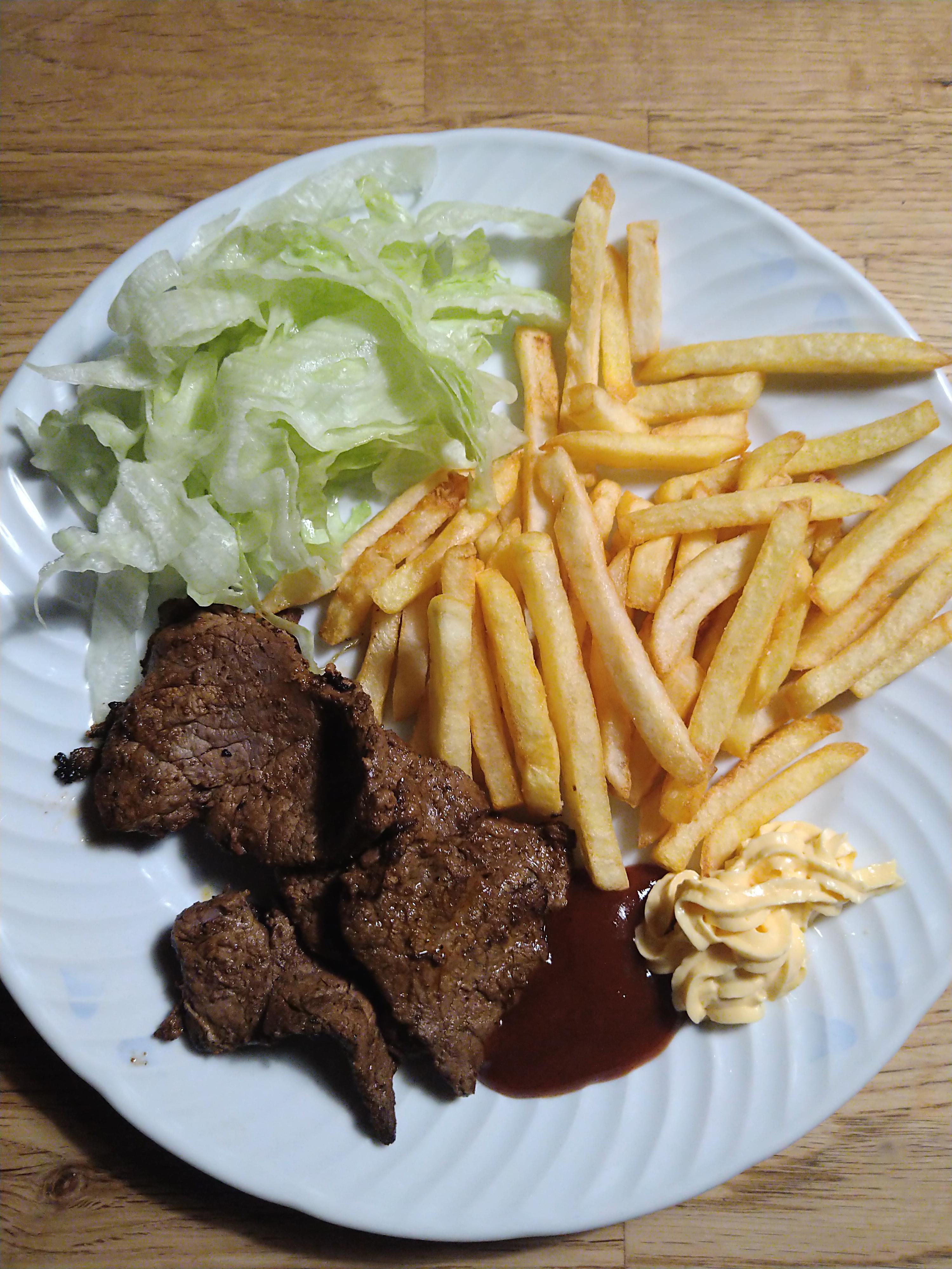 Publicerat Januari 26, 20251 yr Detta är en populär post. Till lunch hade frugan gjort Tandoori kyckling med ris. Jag å barna äter jordnötter till. Middag åt vi älg som vi skavat och fått ligga ett dygn i chili marinerad innan vi steker. Pommes, sallad, cheddar dressing och bbq sås sweet and Smokey plus vitlöksbaugette på sidan om. Svårslaget! Äter alltid mycket när vi har detta på bordet. Känns alltid som man vill äta mer men samtidigt att man ätit för mycket. Efterrätten långt efteråt. Glass jordnötter och chokladsås