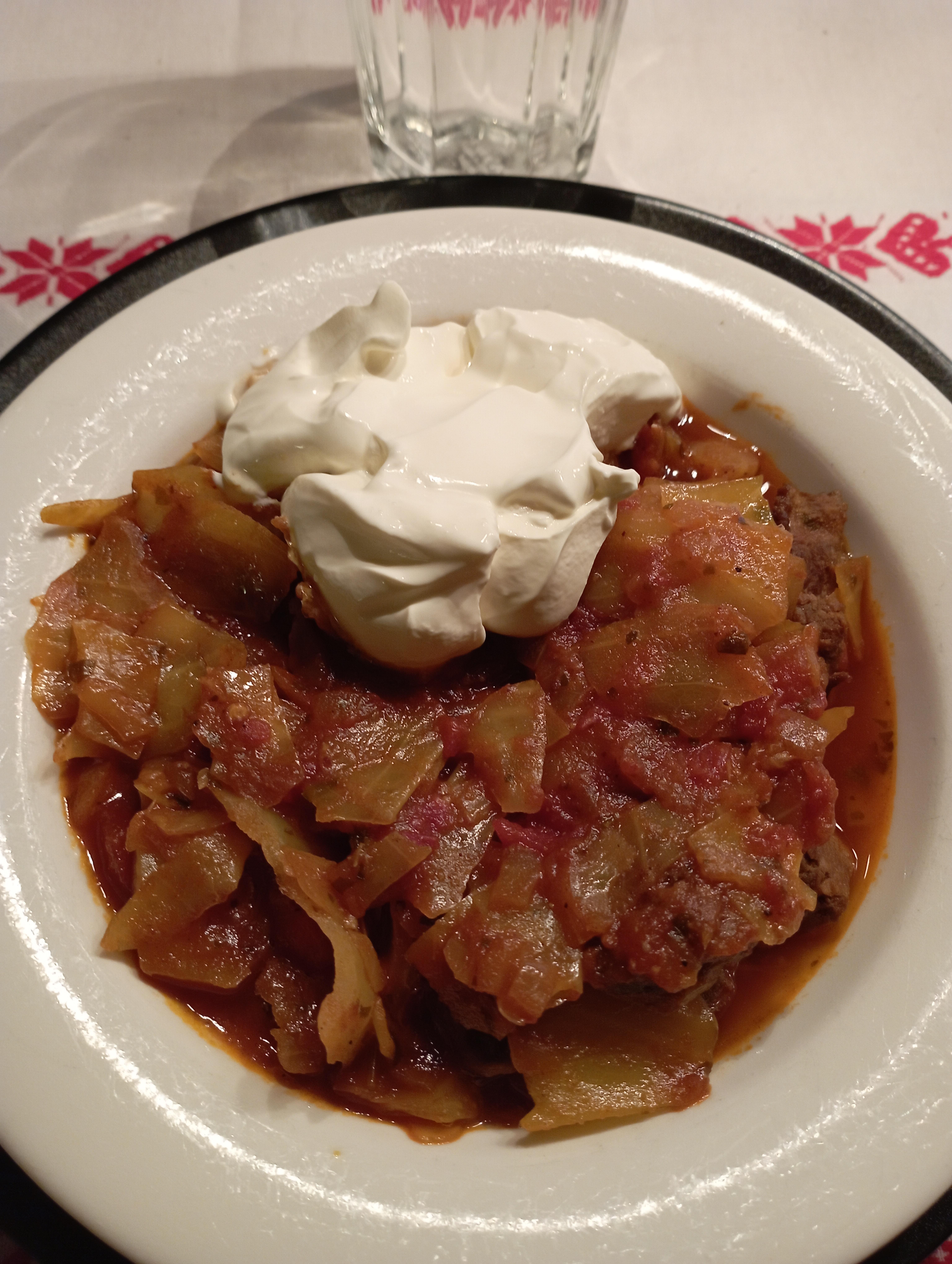 Publicerat Januari 28, 20251 yr Shakshuka. Gjorde en för mig ny maträtt på kvällskvisten. Blev bjuden på en variant hemma hos dottern som var väldigt god. Så, tog inspiration av henne meen skippade saffran (hade inge hemma) som ersattes med ingefära, bytte även proteinkälla - från ägg te 1kg grytbitar av rå (stektes separat fösst innan gemensamt bad i stora baljan), samt det låg ett ½-t vitkålshuvud i kylen som ersatte bönerna (tack o lov). Toppades med creme fraiche. Blev väldigt bra. Värmer även kall. Kul å prova nå nytt. /P