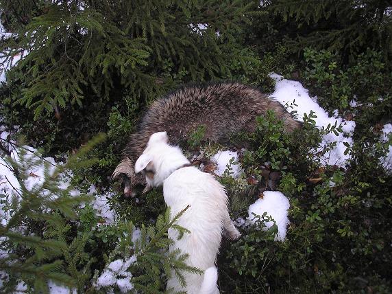 Publicerat April 9, 200620 yr Författare Det har blivit några till sen jag skrev sist. I dag var vi ute och spårade två st. mårdhundar som hade krypit under en stor sten. Så det blev till att ringa efter han som har hund. Fram med spade och spett, men det gick inte att komma ner till mårdhundarna eftersom det var stora stenblock i vägen. Men så av någon anledning så flytteade dom på sig så jag hade turen att få fast en (viddjo)- björkslana fast snurrad i en av mårhunarna, så det var "bara" att dra ut den och avliva den med ett skott i huvudet. Den andra (hanen) jobbade vi med ganska länge med den låg säkert uppe på en liten hylla så vi avbröt jakten för denna dag.