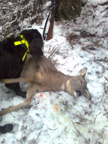 Publicerat November 21, 201015 yr Var ute med laget och jagade småvilt. Jagade först med en drever som hade riktigt fin jakt runt backen som jag stod på. Hör att det kommer närmare och ser en liten bock som trippar 100m bort. Börjar att sikta in mig på den och väntar till den ska komma lite närmare. Hör hur det fräser till i snön, och ett smaldjur kommer på 15m håll. Naturligtsvis kastar hon, men då var redan svingen med kombin på väg, och ett dåligt skott var ett faktum Ser hur hon skuttar iväg upp i skogen. Har man inte jobb skaffar man sig jobb Spårar lite själv ca 80m och efter halva den sträckan börjar det bli blodstänk. Vi kopplade drevern, och jag fick gå till bilen och hämta wachtel`n. Går fram med henne till skottplatsen och börjar spåra. Vi följer spåret ca200m innan jag bestämmer mig för att släppa. Hela tiden har jag blodstänk. Ser på gps:en att hon drar iväg 260m, och sedan snurrar runt vid en liten skogsbacke. Efter ca4min släpper hon och kommer tillbaka . Hela tiden som hon var borta var hon tyst. Inte ett skall. Sätter henne på spåret igen och säger sök. Samma visa igen bort till backen och sen tillbaka. Efter det gick hon över till frisök och verkade mest vilja hitta nåt att jaga. Började att sakta gå mot backen som hon sprang runt hela tiden, då kommer hon som en raket och förbi mig mot backen. Ser att hon springer fram till en sten och nosar till sen fortsatte hon på en sök runda. Kommer tillbaka och drar förbi stenen igen Går fram till den och tittar och ta mig tusan om inte smaldjuret låg där Vet inte om hunden dragit omkull och gjort slut eller om djuret låg dött där. Hon har aldrig varit överdrivet bytes medveten. Men när jag var i närheten så var hon relativt hård på djuret. Men det bästa var att vi lyckades att hitta djuret, det hade gått nästan 500m från skott platsen. Hagelskott kan vara ganska besvärliga när det blir eftersök har jag märkt.
