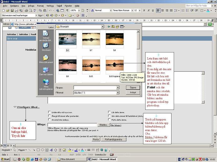 Publicerat Februari 16, 200620 yr En tråd som kan hjälpa nya på Forumet at lägga in bilder. Om någon vill tillägga nå´t eller förklara på annat sätt är jag bara tacksam. MVH Beretta ------------------------------------------------------------------------------------------------------------------------- Gör såhär: Tryck: Nytt ämne eller Svar (Som vanligt när du ska skriva..) Tryck: Ytterligare tillval. (Under textrutan) Tryck: Bläddra (Till höger om Bifoga fönstret) Sök den bild du vill ha med från din dator. Dubbelklicka på den och tryck Öppna. Nu ska genvägen till bilden synas i ditt Bifoga fönster, under Text rutan. (Obesrvera att bilderna inte ska vara så stora och kolla att det är en JPG bild) Fyll i text i Textrutan. Tryck Posta.