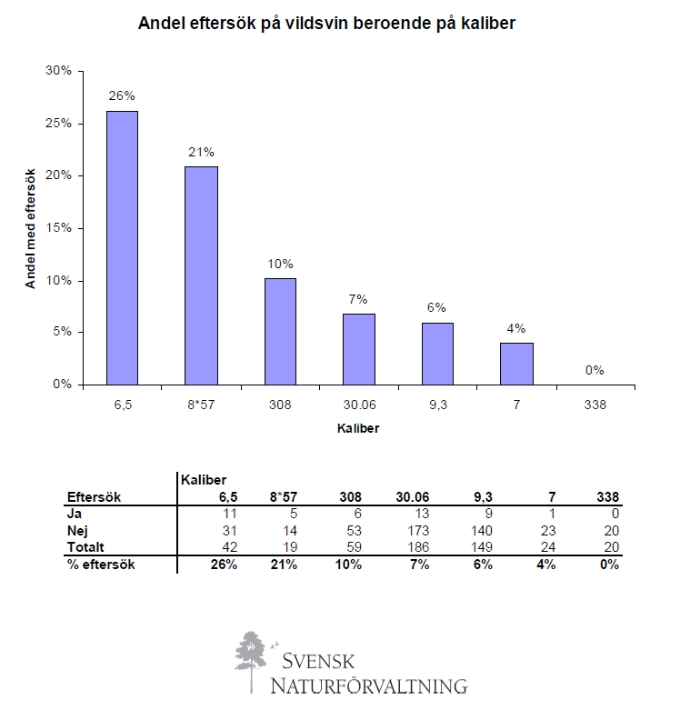 Inte helt dum slutsats ;) Jag plockade för skojs skull fram statistiken från vildsvin i mark. Den ser lite annorlunda ut, och omfattar 1/5 av mängden djur i den ovan diskuterade statistiken. 100% grisar som utsattes för 338, 375HH, 8mm eller 7mm blev kvar på plats. 100% av grisarna som sköts med 270 fick sökas. Men dessa kalibrar användes bara vid 1-2 skottillfällen per styck så de kan man egentligen inte dra några slutsatser av. Men kikar man på dem som använts för mer än 10 grisar så faller statistiken avseende eftersöksbehov ut på följande vis: