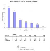 Inte helt dum slutsats :wub: Jag plockade för skojs skull fram statistiken från vildsvin i mark. Den ser lite annorlunda ut, och omfattar 1/5 av mängden djur i den ovan diskuterade statistiken. 100% grisar som utsattes för 338, 375HH, 8mm eller 7mm blev kvar på plats. 100% av grisarna som sköts med 270 fick sökas. Men dessa kalibrar användes bara vid 1-2 skottillfällen per styck så de kan man egentligen inte dra några slutsatser av. Men kikar man på dem som använts för mer än 10 grisar så faller statistiken avseende eftersöksbehov ut på följande vis: