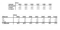 står det som rubrik på försättsbladet. Sammanlagt ligger andelen eftersök på 11%, totalt utgörs statistiken av 597 grisar. De år då störst andel grisar fällts vid vakjakt är behovet av eftersök större än de år då hundjakt dominerar.