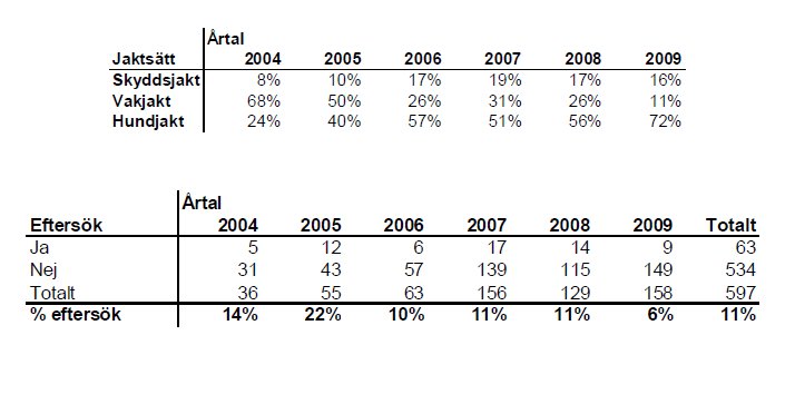 Statistiken som jag har från vildsvinsklubben är inte helt enkel att vare sig använda eller utläsa och jag har inte tillgång till den i dess helhet. Men jag lägger med två till utdrag, det ena visa fördelning av jaktformer det andra visar mängden eftersök. Allt redovisas årsvis. Det man då kan se är att vi har en stor mängd eftersök de år då vakjakt dominerat och färre eftersök de år då hundjakt dominerat. Samtidigt skall man vara på det klara med att man i början var rätt grön på det där med vildsvinsjakt vilket i sig kan vara en bidragande orsak till högre eftersöksbehov.