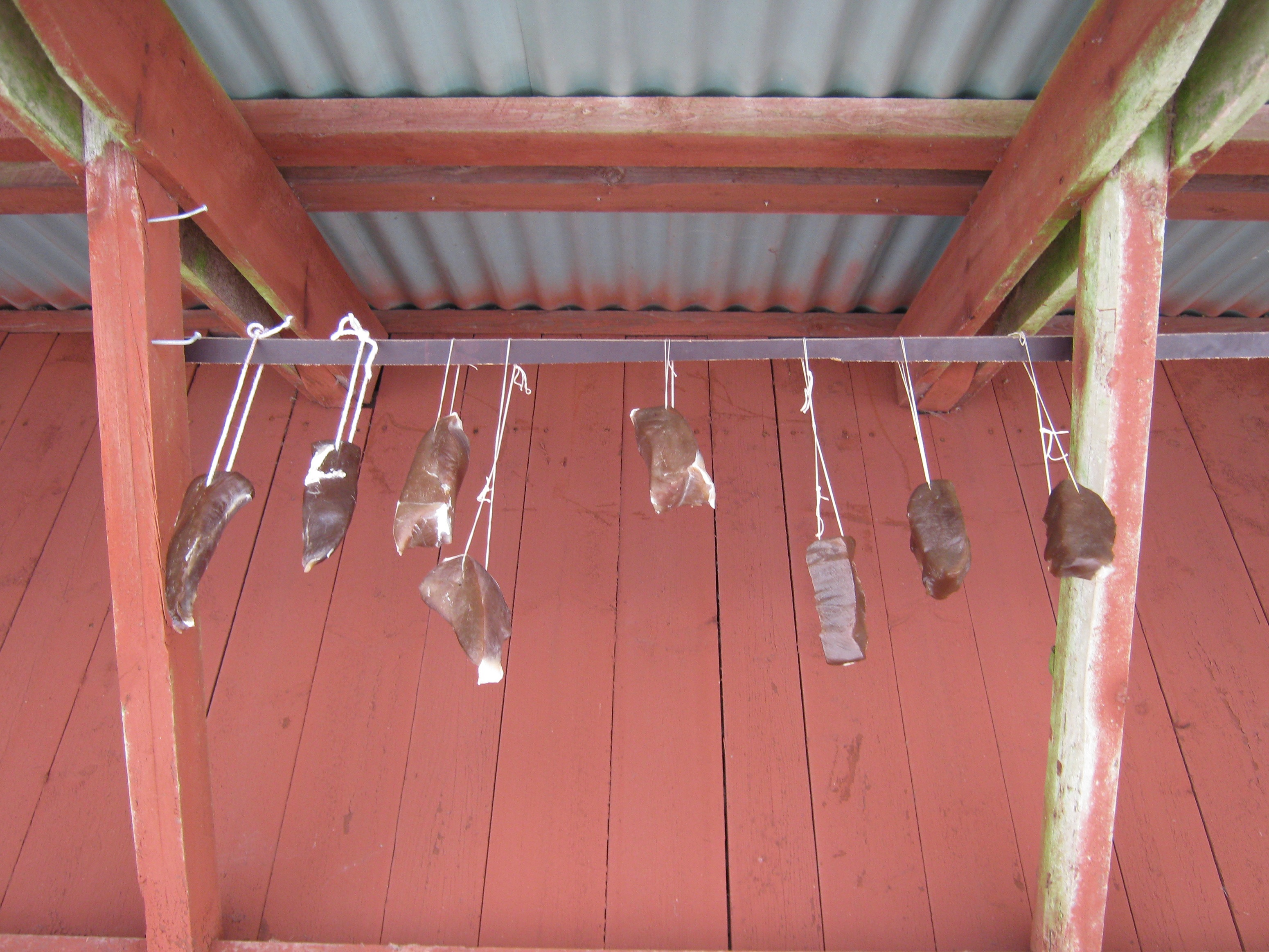 3 dygn ska köttet ligga i saltlagen skuret i grova bitar som falukorv ungefär. Vänd på köttet medan det ligger i saltlagen så att det får samma gråaktiga färg runt om. Minst 3 v. på norrsidan på huset men ändå luftigt och ingen sol.