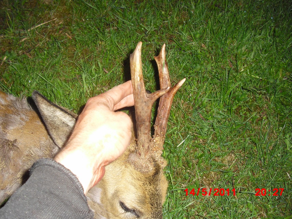 Publicerat Maj 26, 201114 yr Jag och kollegan var ute i morse på hans mark. Vi tog ett "friskvårdspass" innan jobbet.... Vi hade planerat att bryta vid 06.30 för att ha marginal om det skulle skjutas nått. Ca 06.15 smög det fram en bock på min sida. Efter en stund tittade den ut på fältet vi hade framför oss. Jag visslade och kollegan sköt.. Rätt fin 6:a, men jag kan inte bedöma ålder. Ganska långa smala horn, men rejäl pärling i nederkant.... mvh/Må En lite äldre bock skulle jag tro, runt 5-7 år. Kolla gärna hur tänderna ser ut, är de nedslitna så är bocken äldre/gammal.