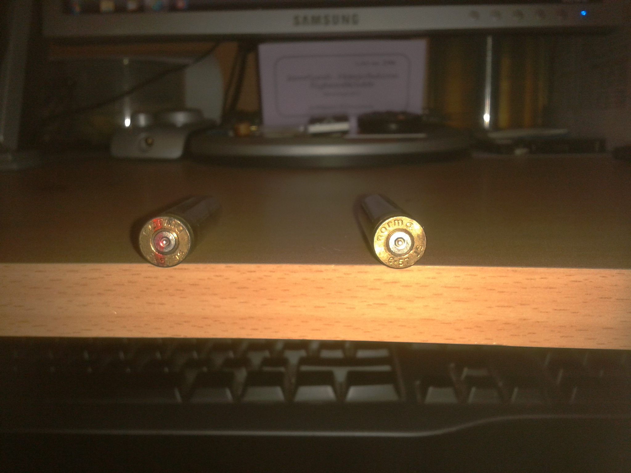 Publicerat Augusti 20, 201114 yr Kikaren på min 8x57 blev utbytt för några år sedan. Tänkte jag skulle ta och skjuta in den i dag. Hade några oryx och Normas fmj laddade. I skåpet fanns även 20 smällar av suspekt ursprung. Handladdade skott som min far hade köpt/fått för typ 20 år sedan. Skulle tydligen vara ämnade för rådjur. Inskjutningen gick bra och jag tänke för övningens skull smälla av rådjurskotten. (Vet inte vilken kula som satt i hylsan, ingen aning om vilket krut som använts, ej heller tändhattar. Så mer än till övning går dom inte använda, tänkte jag!) Förstasmällen gav att det verkade vara ett riktigt snabbt krut. Men lågt laddat för det blev ingen rekyl värt att nämna. Andra skottet gick som det första. Tredje smällen så, klick pssssssss PANG. Kan tänka mig att gamla svartkrutare med flintlås fyrades av med samma fördröjning. Jag noterade även att det sved lite i ögonen efter varje smäll... Konstaterade att foten på rådjurshylsorna var ordentligt sotad. Inget sot på halsen, skuldran eller själva hylsan, utan bara foten(i spåret) men inget på undersidan. Tändhatten uppvisade inga fel.... Spridningen på de 3 skotten var ca 40 cm, mest i höjdled men även 8-10cm i sida. Oryxen och fmj som jag laddat låg på 30-45mm på 100m. Oryxen gav de tätaste träffbilderna. (Testade även några Sellier bellot som spred runt 15cm i höjdled, i sida så spred ingen av dessa tre kulor mer än 25mm) Kommer att slå ur kulorna, tömma krutet och panga tändhatten ur resterande skott. Ingen jag törs smälla i bössan... Men hur i h.... kan krutgaserna läcka ut bakvägen när tändhatten är intakt??? Hylsan till höger är "vanlig". Alla hylsorna är alla lite "gammla" och delvis ärgade... Hylsan som är rödmarkerad är "rådjurs" ammon, den till höger är vanlig...