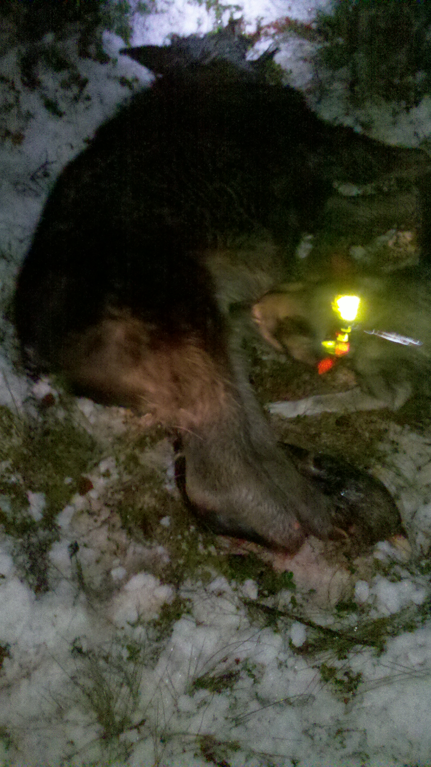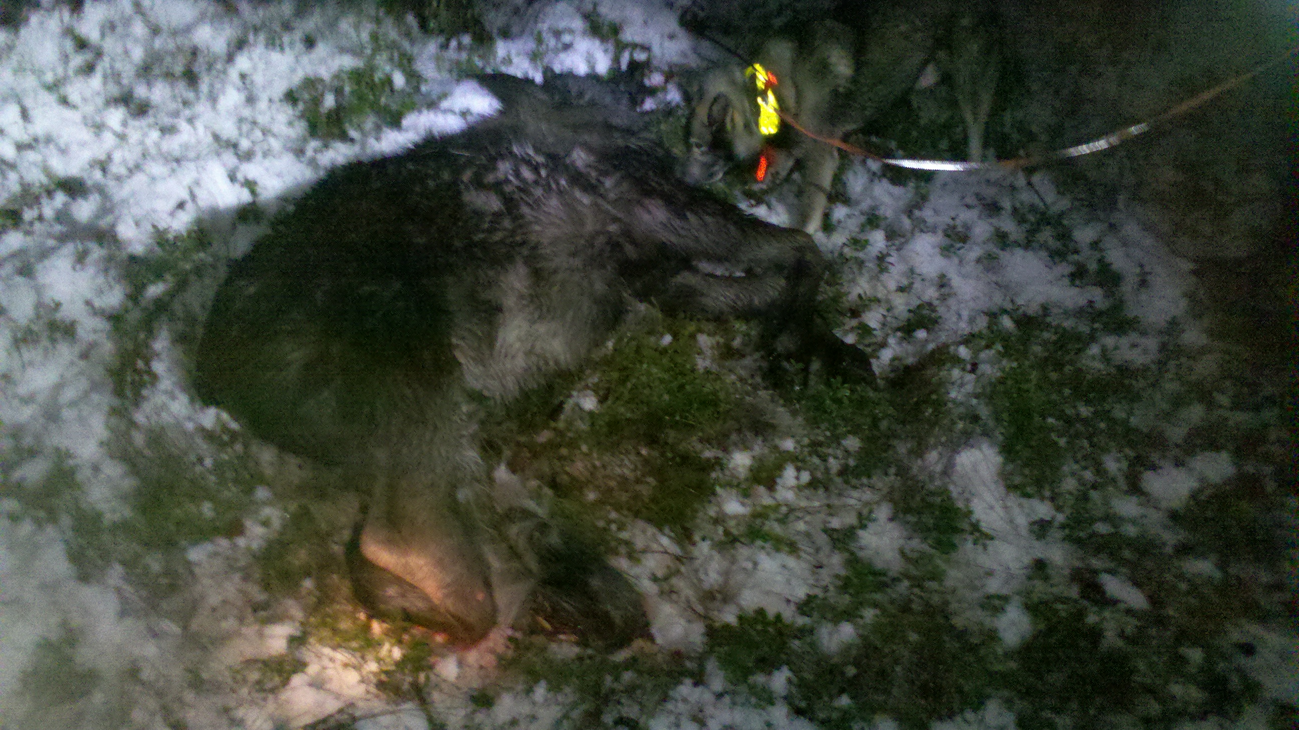 Publicerat December 8, 201114 yr Banverket eller polisen ringde villket det nu va och sa att tåget hade kört på en älg och den var inte dödligt träffad. Men egentligen tror jag inte vi får gå på tågeftersök men efter lite ringande så fick vi göra det med hjälp av 2 andra personer på banverket. Dom hade redan varit där och kollat och sett att det var blod bägge sider om spåren så vi anade att det var två djur inblandade. Kom fram till platsen och där va en hel del blod och en massa älgslag. Dom hade huggt några tallar och där hade dom stått och ätit. Men jag och ena killen började spåra på ena blodslaget som var lätt att följa. Slagen såg inte helt ok ut så jag trodde den skulle ligga rätt nära. När vi kommit 150m ifrån så ringer jag farsan och säger till han att han får gå ifatt oss med figo så vi får med oss han också, trodde faktiskt att älgen skulle legat närmre. Men vi tog 10m till och då ser jag 2 ögon 50m längre fram i mossen. Så jag smög mig fram och kunde avsluta kalvens lidande. Visade sig att bägge bakbenen var helt av, kan inte fatta hur den orkat gå 200m. Sen gick vi tillbaka till där olyckan hände och spårade kon och den andra kalven men kunde inte se något fel på slagen eller något blod efter dom. Men kalven hade legat på den sidan järnvägen först för där fanns både märg och rörbensbitar innan den lyckats gå iväg åt andra hållet. Bilder kommer nog ikväll..