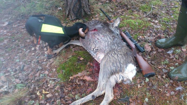 Publicerat December 16, 201114 yr blev uppringd av en granne i morse strax efter sjutiden då ett rådjur blivit påkört längre ner i byn.. vi åkte ut när de började ljusna och testade hans hund på spåret och djuret visade sig dragit ner ut över älven.. sen som ja inte vart med om innan att 2 timmar efter kollisionen när vi kommer dit så börja vi följa spåret ner över en åker och då när vi var ungefär 250m ifrån så reser sig djuret och skuttar iväg och vart osäker på om de va de djuret då de efter en sån kollision brukar ligga å trycka bra länge på legan så jag väntar med att skjuta trots bra skottläge men vill vara säker på att de är rätt djur vi såg vilket de visade sig vara...hundföraren fortsätter att spåra ner längs med älvkanten och hunden blir mer ivrig ju närmare den kommer då djuret ligger å trycker i vasskanten.. får signal om att de ligger nånstans framför hundekipaget och står uppe på en kulle så jag ser bra neråt vattnet, sen flyger djuret upp och tvärvänder när den få se mig och ner i älven..första gången ja ska skjuta ett djur i vattnet men lyckas samla tankar och allt och avlossa skott djuret är träffat och driver med strömmen neråt efter att ha fått göra ett lasso med en sten så efter många om och svordomar så fick vi tag om djuret och kunde hala in det utan att behöva bada... visade sig vara en bra träff genom lungorna.. måste även säga att de va inte de lättaste att se vart man skulle skjuta för att få bra träff men med lite tur så gick de vägen ändå räckte med ett avlossat skott den här gången... och de va inte nåt varmt att vada i älven så tanke på att bada de fanns inte... Vinterbad ska ju enligt många vara stärkande och hälsosamt?????Grattis till ett lyckat eftersök och ett bra skott...