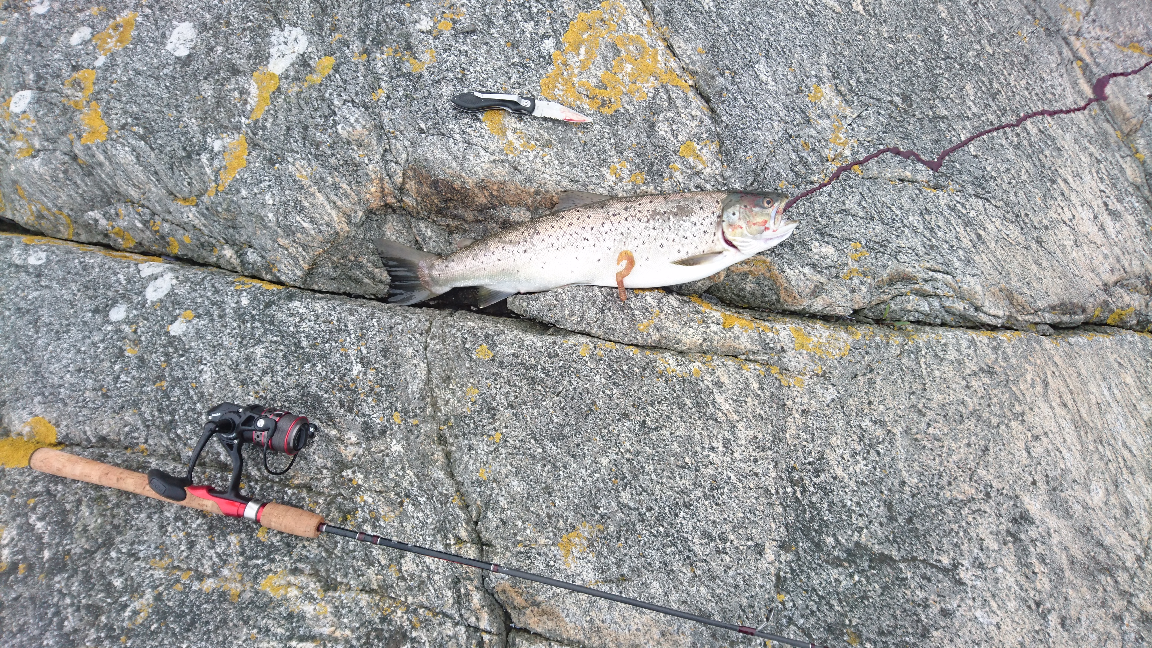 Publicerat Juli 10, 20169 yr Jag lyckades få en fin öring imorse Väl hemma så fick jag mätt och vägt den, 58cm och 1,9kg Trevlig sak som högg på en torskjigg vid en vindpinad udde. Flera kom upp under morgonen men endast denna höll måttet.