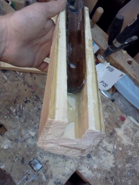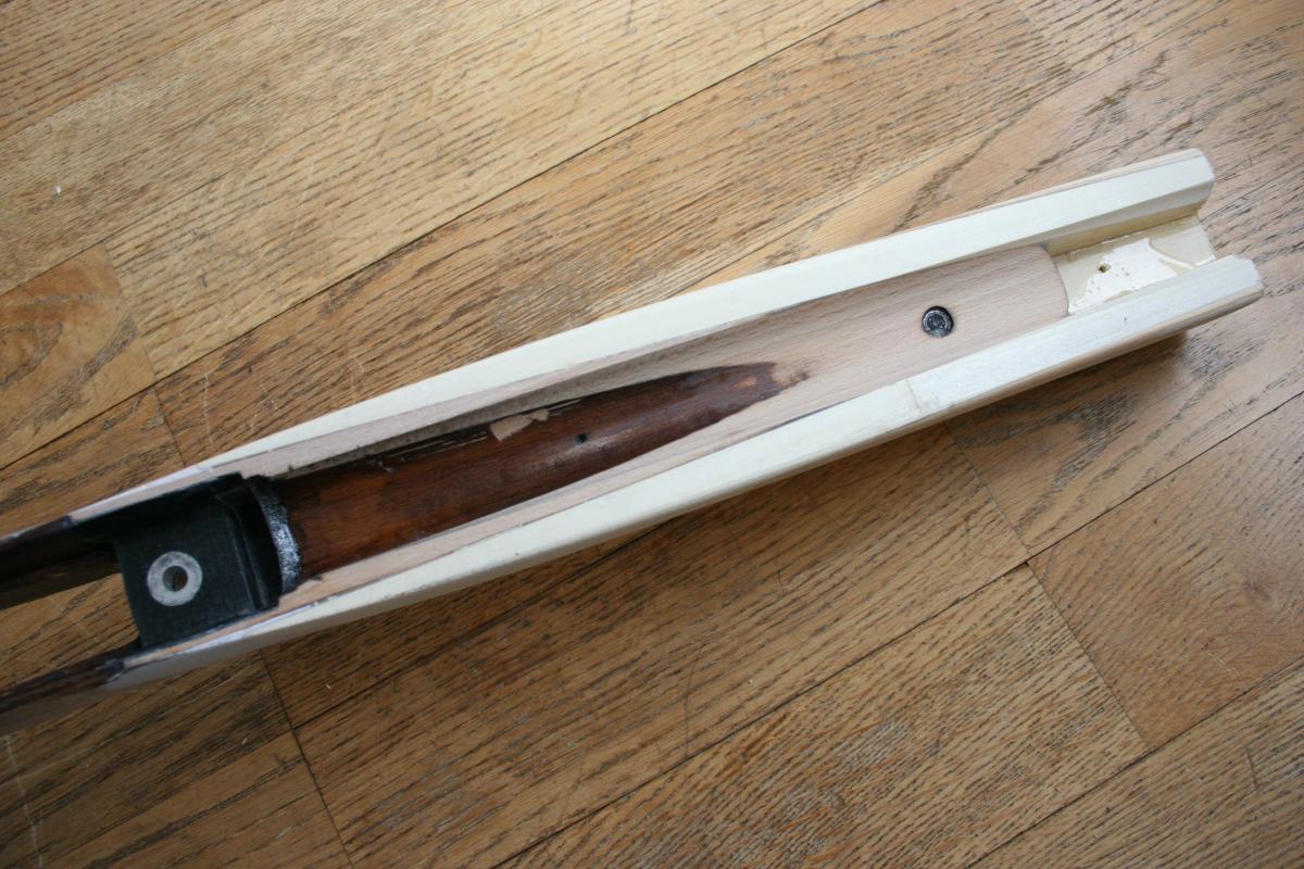 Publicerat Februari 8, 201313 yr Författare 25mm pipkanal börjar ta form, ett 25mm alurör med sandpapper, väldigt lowtech, väldigt skavsårsframkallande men det funkar utmärkt. Den uppmärksamme ser att pipkanalen är bredare än hela förstocken. Det hade mao varit helt omöjligt att dra i en 22mmpipa i denna stock, förstocken hade mer eller mindre försvunnit.