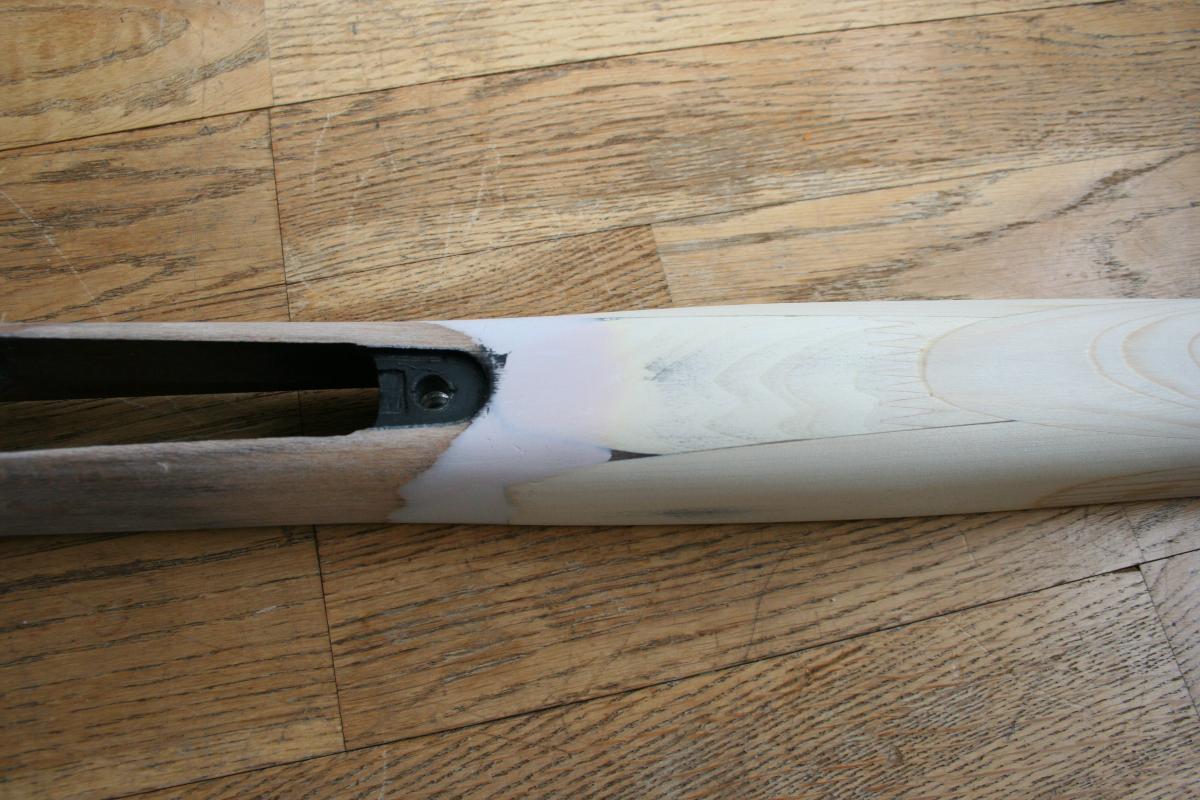 Publicerat Februari 5, 201313 yr Författare Klyver av en remsa på ovansidan av kolven för att kunna limma på en list och höja kolvkammen. Då jag planerar att lägga glasfiber runt hela så nöjer jag mig med en bit kvistfri gran. Den går så långt fram att det precis går att ta ur slutstycket. Jag börjar misstänka att denna stock rent estetiskt kommer att bli en riktig mardröm, med linjespel som en Sovjetisk attackhelikopter, men nu är det lite sent att ångra sig
