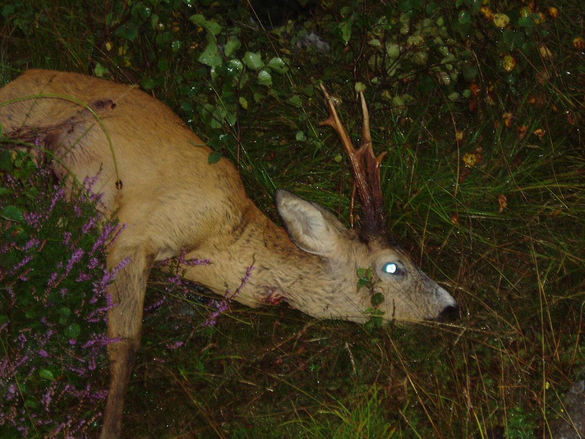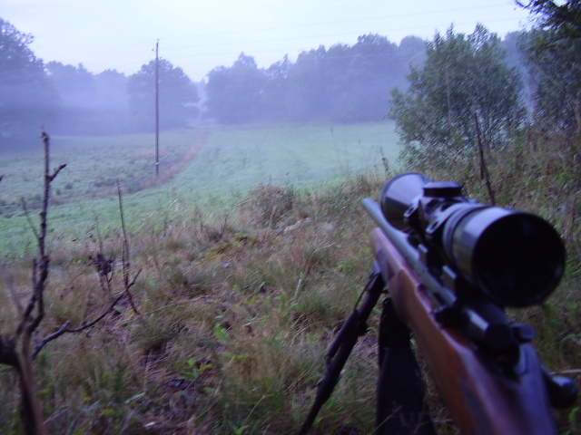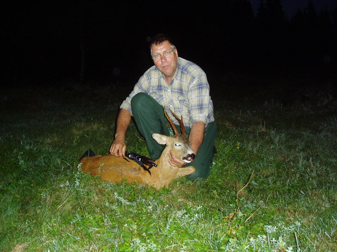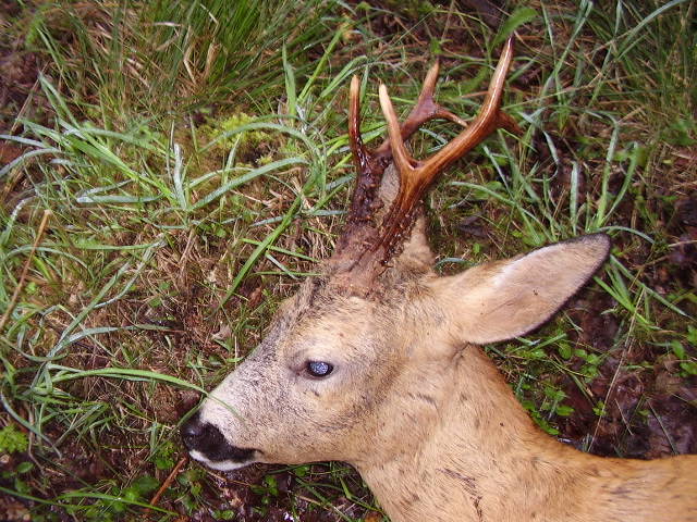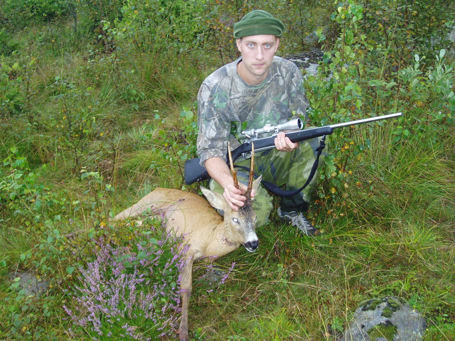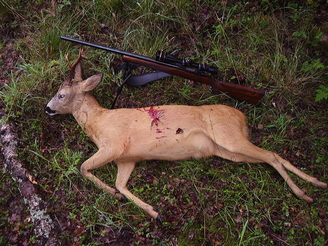 Publicerat Augusti 24, 200619 yr Efter 1.5 timmes smygjakt imorse så fick jag syn på denna herre,efter att ha krypit 100m i ett litet dike så kom jag i skydd av en liten holme och kunde smyga upp på den och lägga mig ner med .223:an. Första bilden är sekunderna efter skottet,bocken stod vid skogskanten ca 120-140m bort. En fin 6:a. /Micke