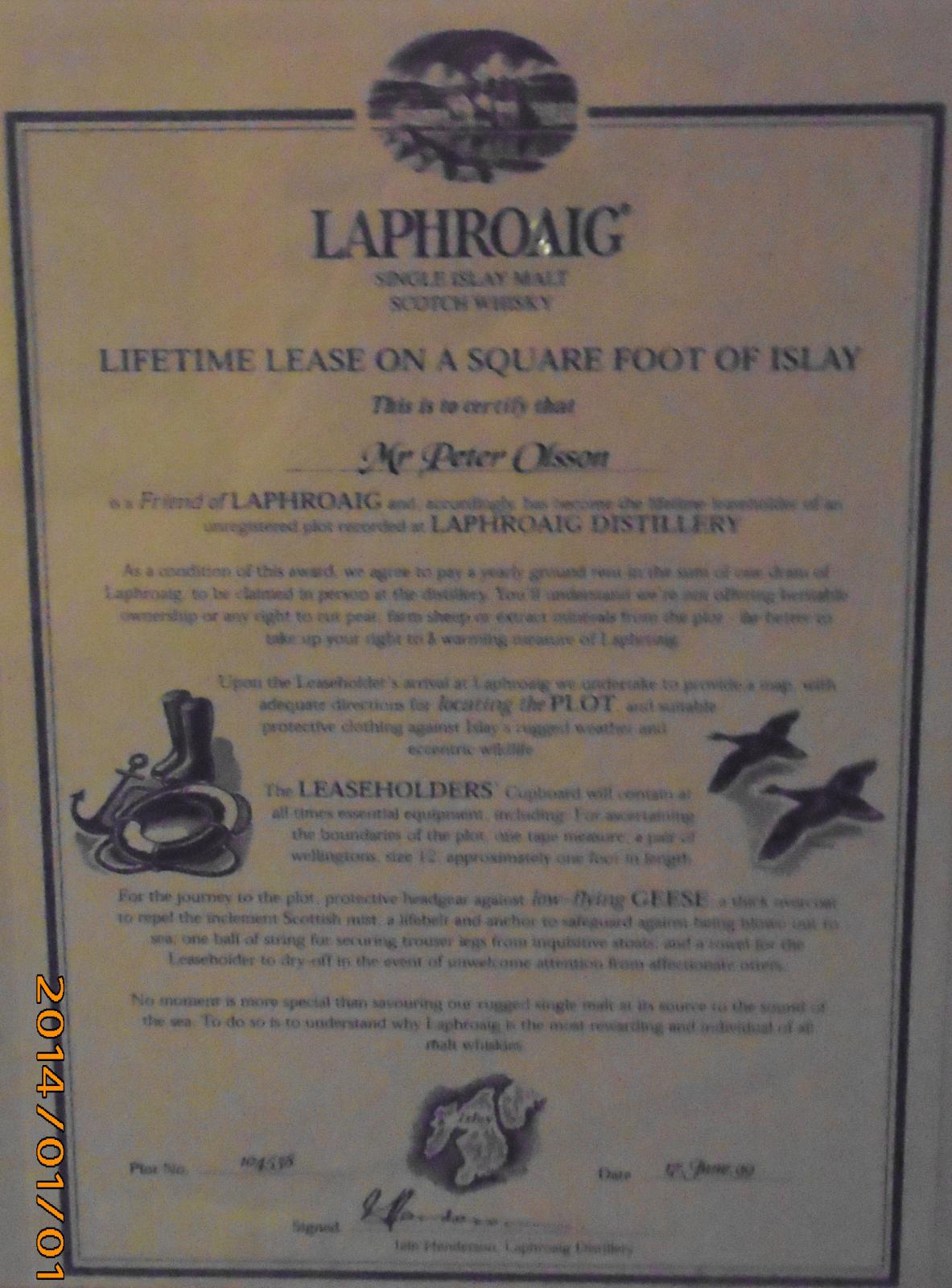 Som Laphroaig-drickare kan man göra anspråk på en kvadratfot land på Islay som man i sin tur "hyr" ut åt destilleriet. Man får en årlig hyra motsvarande en väldigt liten flaska ängladryck om man kommer personligen för att hämta den. Det finns tjocka liggare på destilleriet där varje "leasholder" finns bokförd på sin respektive, numrerade kvadratfot. Alltså, inget som egentligen betyder nå't, bara en kul grej. Den faktiska kvadratfoten finns och man kan med hjälp av en karta leta upp just sin egen kvadratfot och försöka stå på den en stund.  :happy:  Såg nu på mitt certifikat att jag firar 15 år i år...