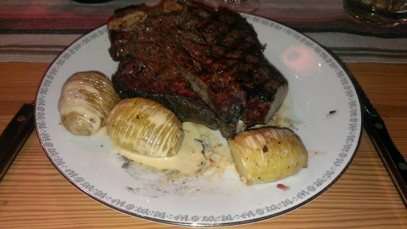 Hasselbackspotatis, rödvinssås och konjaksås. Nedsköljes med ett Amarone.