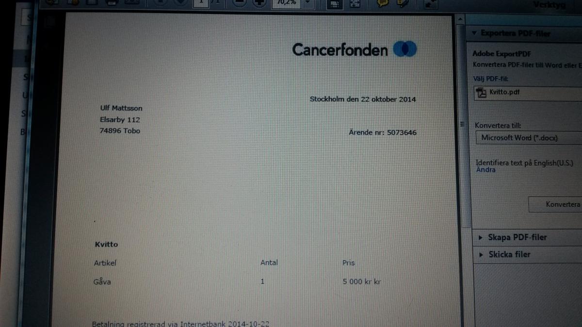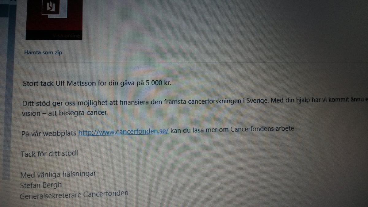 Publicerat Augusti 4, 201411 yr Tack för din gåva Vi är både glada och tacksamma över att du stödjer Barncancerfondens verksamhet. Alla bidrag är betydande för fortsatt forskning och utbildning inom barncancer. Vi har mottagit följande beställning: Ordernummer: 2512821Betalningssätt: Kort - MasterCard/VisaGivarnummer: 6116883Givare: Magnus FermskogAdress: Marhult, 36073 Lenhovda Sak á-pris Antal Summa Gåva 500 kr 1 500 kr Totalt: 500 kr Varmt tack.Olle BjörkGeneralsekreterare