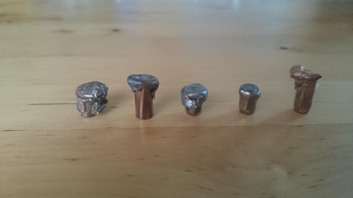 Publicerat Augusti 27, 201411 yr Okej. Med kulvikterna i huvudet tänker jag:Core Lokt Ultra Bonded (Skulle den kunna ha varit hälften rätt?)InterbondAccubond (Skulle den också kunnat vara hälften rätt då en Accubond ju i princip är en bondad Ballistic Tip?)?Hornady GMX2:an skulle kunna vara en A-Frame men tycker den borde vara mer utbuktande då (Fast å andra sidan, om den är en A-Frame måste anslagshastigheten varit rätt låg), 5:an skulle kunna vara Nosler E-Tip också. Hmm... Får be om en ledtråd till - Har alla kulor skjutits från samma avstånd från vedhögen och har alla varit ungefär maxladdade?Inte lätt, men roligt... Vill inte fler vara med och leka?